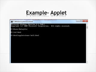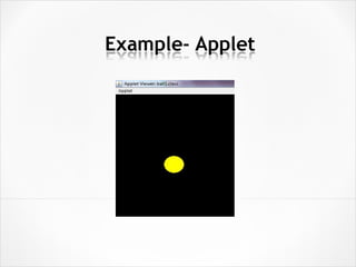 An applet is a Java program that runs in a web browser. It allows for interaction and is embedded in a web page using special HTML tags. Applets have limitations compared to standalone applications, as they run in a sandbox without access to the client file system or network. Applets follow a specific lifecycle of init(), start(), stop(), and destroy() methods to control their execution.