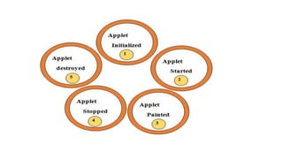 An applet is a Java program that runs in a web browser. It is embedded in an HTML page and runs in the Java Virtual Machine (JVM). To create an applet, a class must extend the Applet class. The applet lifecycle includes initialization, starting, painting, stopping, and destruction. Applets allow Java programs to be run from web pages and have graphical user interfaces.