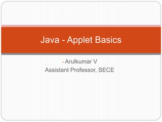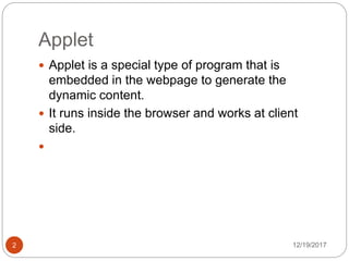 An applet is a special type of program embedded in a webpage to generate dynamic content. It runs inside the browser at the client side. Advantages of applets include less response time since they run on the client side and can run on multiple platforms. The lifecycle of a Java applet includes initialization, start, paint, stop, and destruction. The Applet class provides lifecycle methods like init(), start(), stop(), and destroy(). To create an applet, the Applet class must be extended and its lifecycle methods can be overridden.