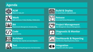 The document outlines the application lifecycle management using Microsoft Visual Studio, detailing processes like source control, test case management, project management, and release management. It emphasizes the importance of Agile and Scrum methodologies, highlighting the principles of the Agile manifesto and how teams can manage their product backlog and improve collaboration. The document also covers testing strategies, build management, and how to leverage tools like SQL Server Reporting Services for monitoring project progress and quality.