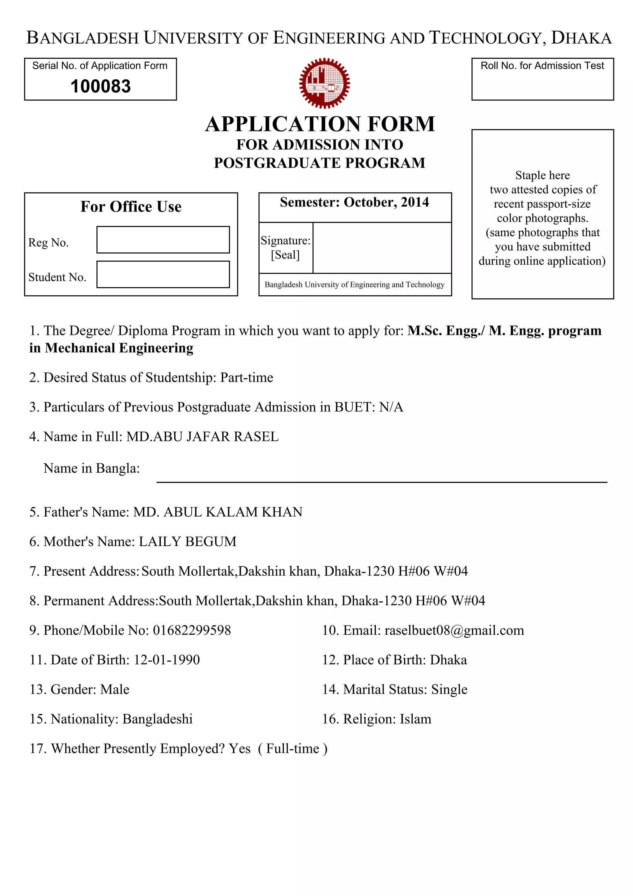 Md. Abu Jafar Rasel has applied for admission to the M.Sc. in Mechanical Engineering program at Bangladesh University of Engineering and Technology as a part-time student. He completed his BSc from BUET in 2014 with a GPA of 3.7. Currently he works as a lecturer at Sonargaon University. The application form provides details of his educational qualifications, work experience, references and documents required for admission.