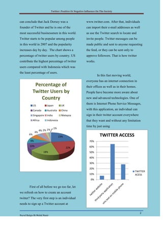 Twitter can have both positive and negative impacts on society. Positively, it allows easy connection with friends and family regardless of distance, and facilitates fast communication. It also benefits businesses by allowing promotion and research of trends. However, twitter can be a distraction, especially for students, and reduce privacy as users overshare personal information. It may also contribute to relationship issues if used irresponsibly. Overall, both benefits and risks exist, so wise use of twitter is important.