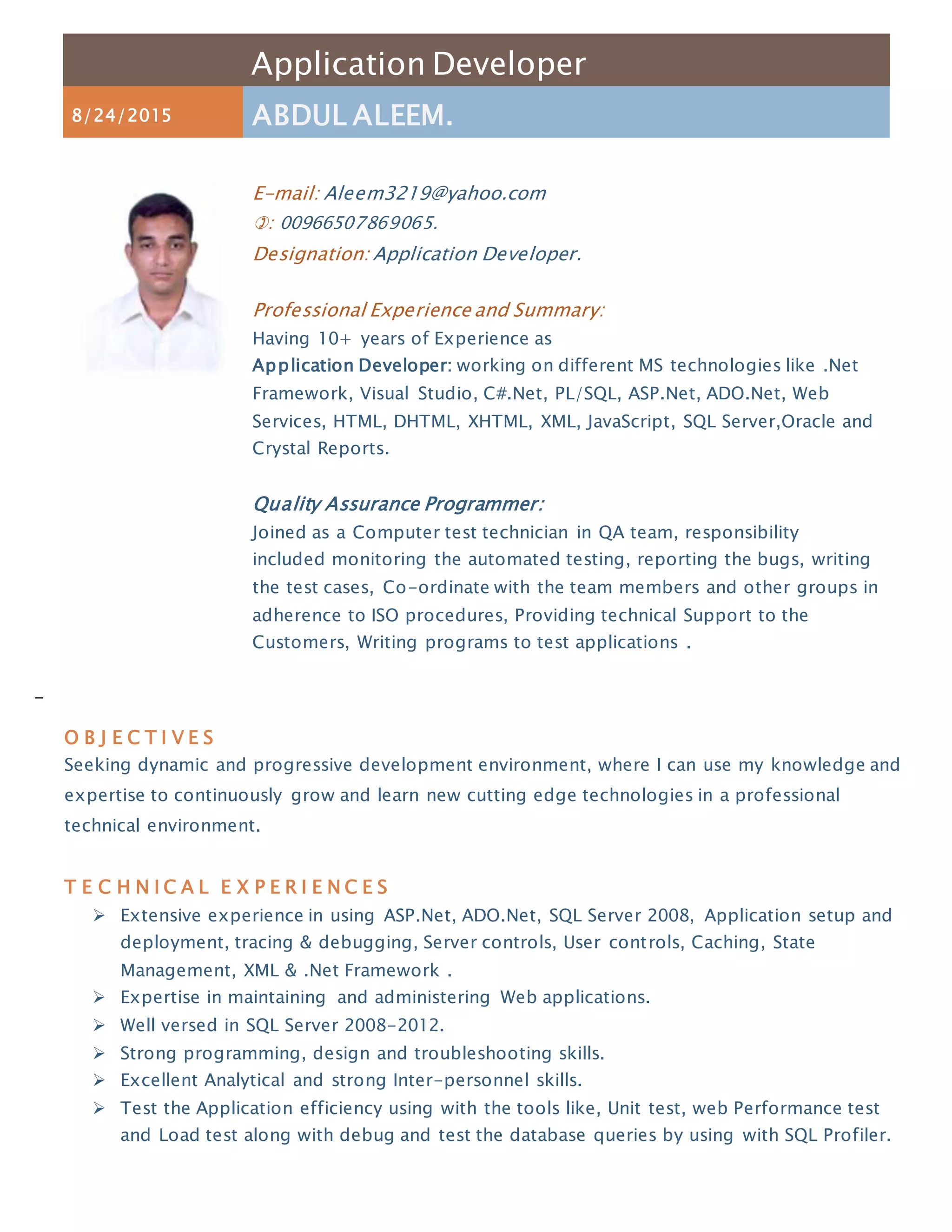 This document is a resume for Abdul Aleem, an application developer with over 10 years of experience developing applications using technologies like .NET, C#, ASP.NET, SQL Server, and more. He has experience as both an application developer and quality assurance programmer. Currently, he is seeking a dynamic development environment where he can continue growing his technical skills. His resume provides details on his technical skills and experiences working on various projects as an application developer and quality assurance tester.