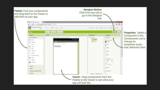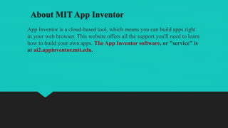 MIT App Inventor allows users to build mobile apps in a web browser without downloading any software. There are three options for setting up App Inventor: 1) use an Android device with the companion app installed, 2) install software on a computer with an emulator if no Android device is available, or 3) install software on a computer to connect to an Android device over USB without wireless. App Inventor consists of a Designer to layout the user interface and a Blocks Editor to program the app's functionality by dragging and dropping blocks together.