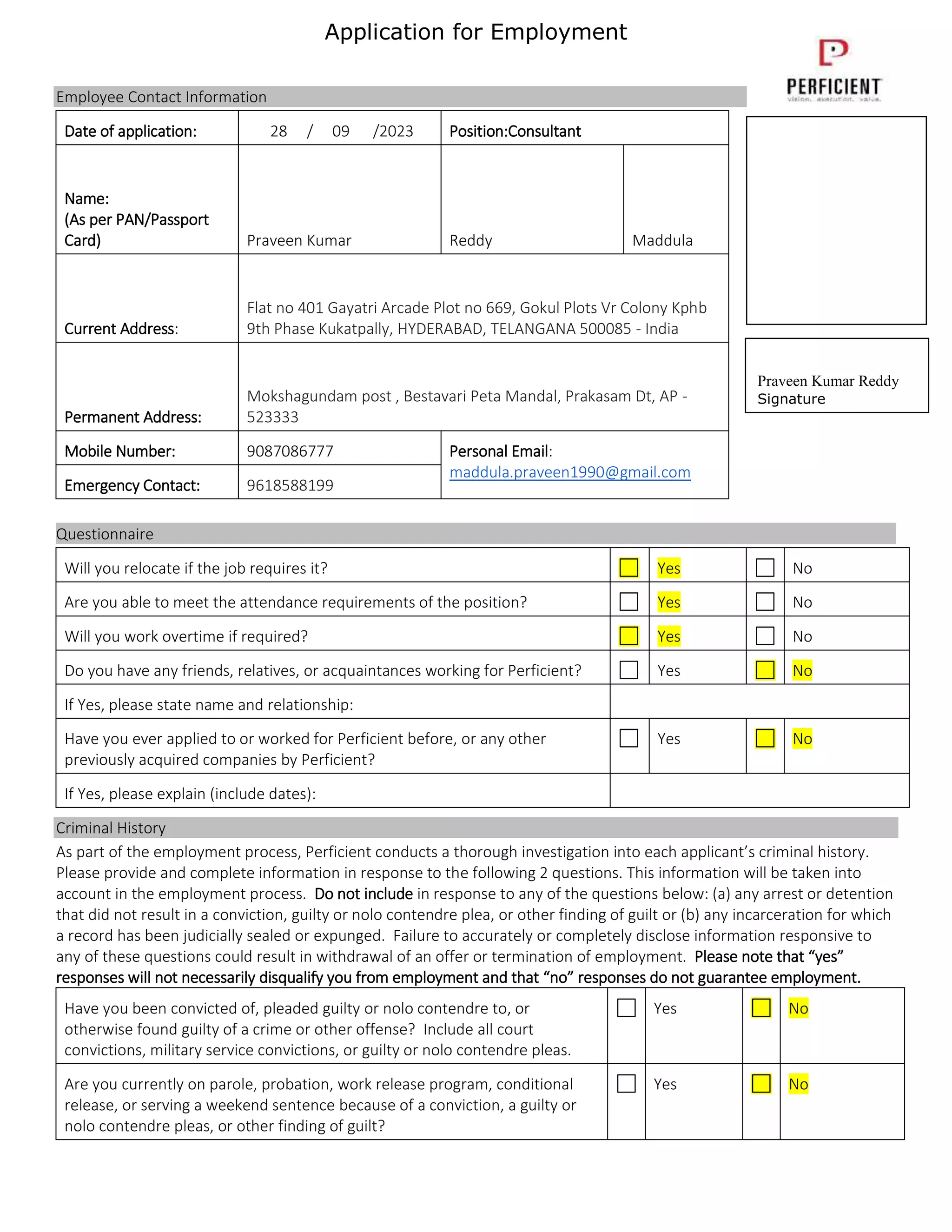Praveen Kumar Reddy Maddula has applied for the position of Consultant at Perficient. He has over 10 years of experience as an Oracle Functional Consultant. His most recent roles include Finance Lead at Technism Solution Pvt Ltd from February 2023 to August 2023. He has a BSC from Hindu College and an MCA from Gates College. Praveen is willing to relocate if required and work overtime. He does not have any criminal convictions.