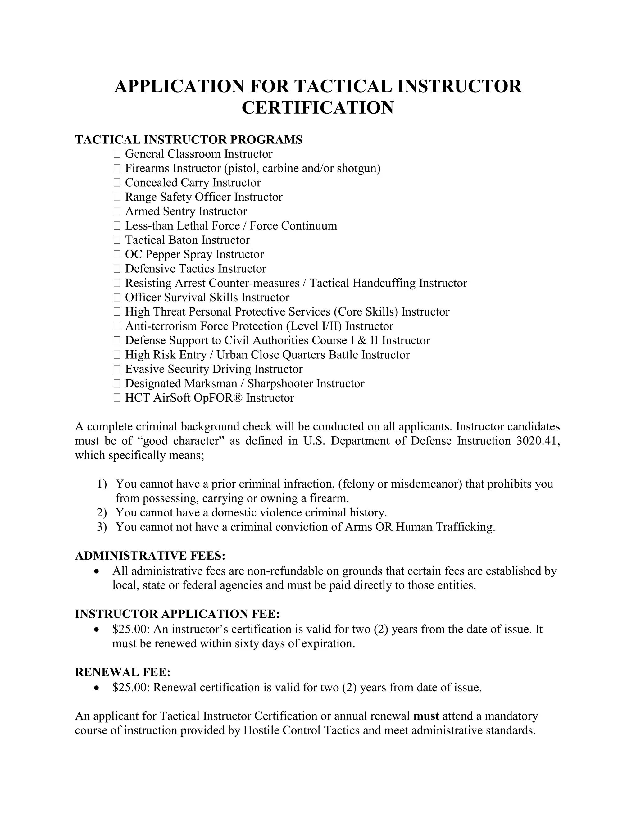 The document outlines the application process for tactical instructor certification across various instructor programs, emphasizing the need for good character as defined by the U.S. Department of Defense. It details administrative fees, course accessibility, and application requirements, including background checks and necessary documentation. Instructors are also responsible for providing course materials, completion certificates, and maintaining updated contact information.