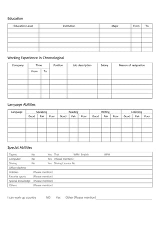 The document is an application for employment. It requests personal information such as name, contact details, education history, work experience, languages, special skills, and references. The applicant provides this information to apply for a position and salary with the company.