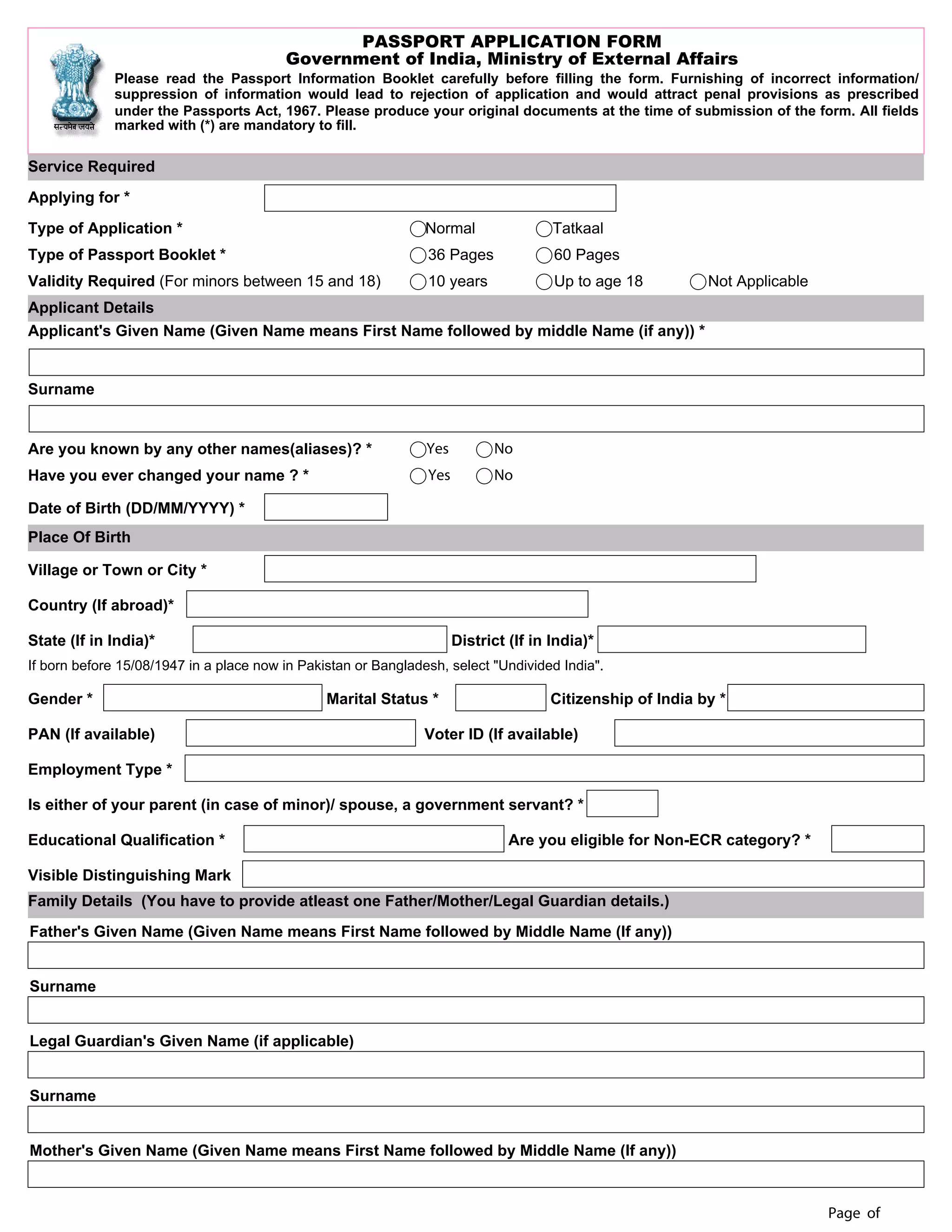The document is a passport application form issued by the Government of India, requiring accurate and complete information as incorrect submissions may lead to rejection and legal penalties. It outlines mandatory fields, applicant details, family information, emergency contacts, previous passport history, and self-declaration regarding legal status and allegiance to India. The form emphasizes the importance of providing original documents upon submission and alerts applicants to the seriousness of furnishing false information.