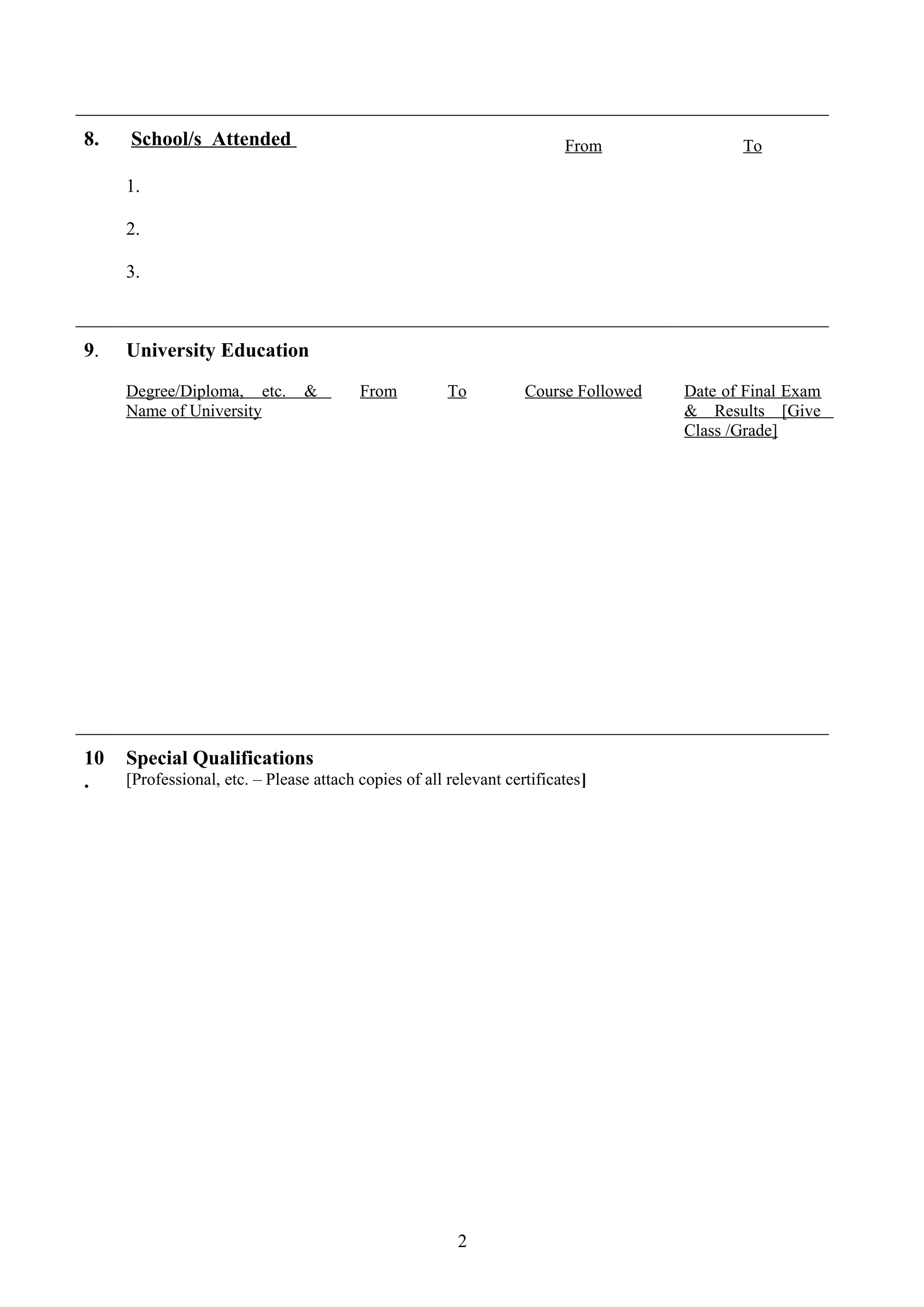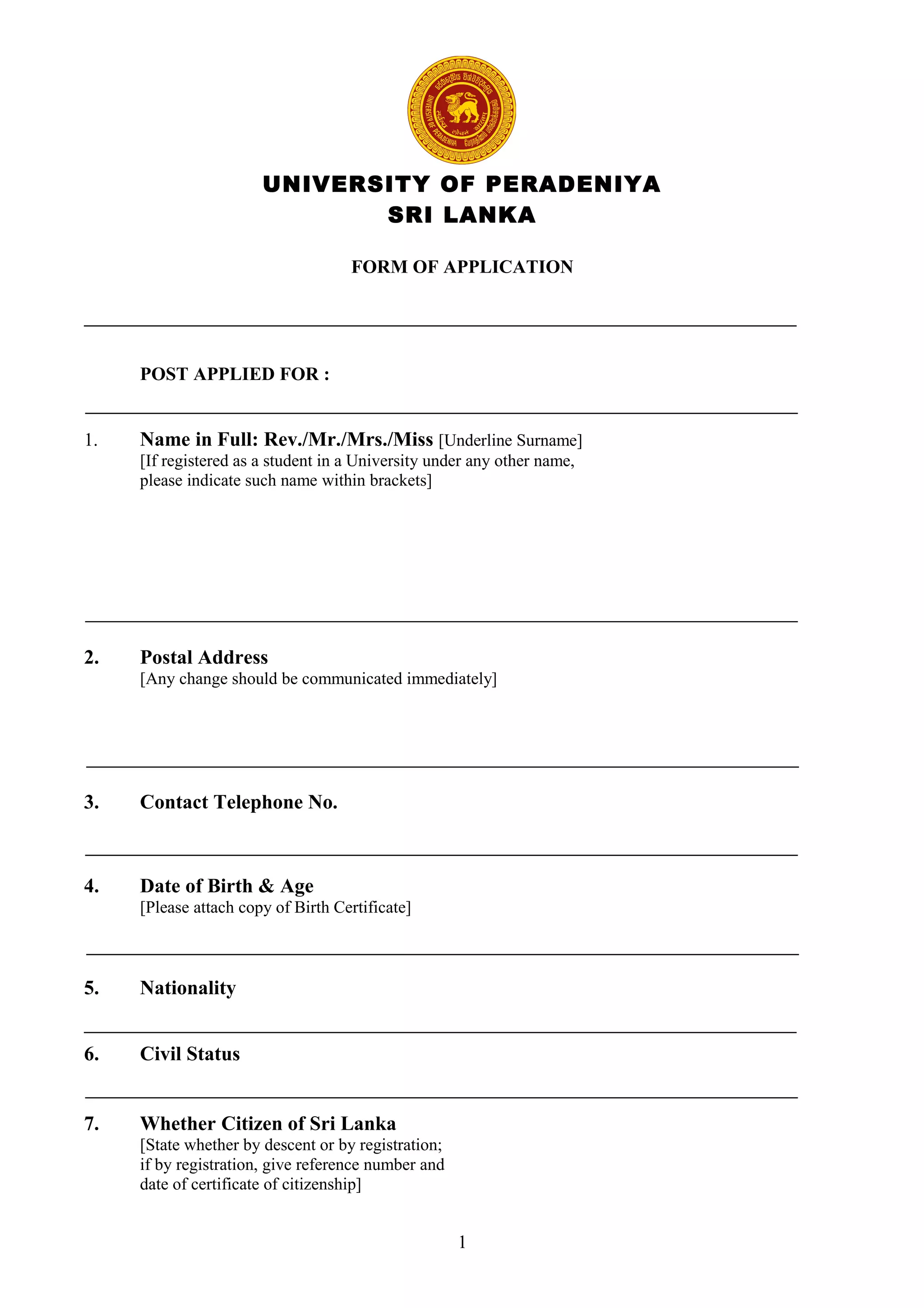 This document contains a form for applicants to the University of Peradeniya in Sri Lanka. The form requests information such as the applicant's name, contact details, date of birth, education history, qualifications, publications, language proficiency, employment history, experience, references, and a certification that the details provided are true. The applicant and head of department where applicable must sign the form.