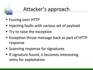 This document discusses application layer fuzzing and the potential information leaks that can occur. It describes how an attacker can inject faults through HTTP requests to trigger exceptions and scan responses for signatures. Errors can reveal details like the technology stack, network architecture, intranet applications, database connection information, file system layouts, and authentication mechanisms. Information leaks occur when deployment components like web servers and databases are misconfigured or have vulnerabilities, or when application source code does not properly handle errors. Various examples show how errors from web servers, application servers, databases, and source code can disclose internal paths, nature of errors, and potential injection points.