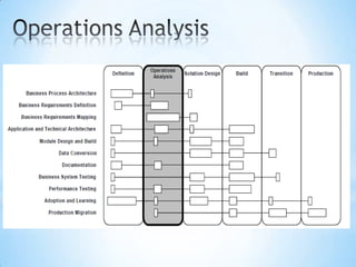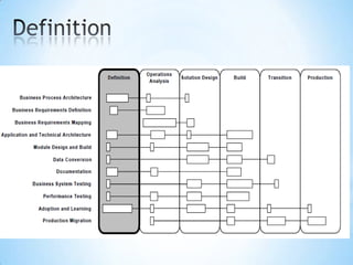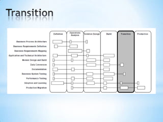 The document provides an overview of the Application Implementation Methodology (AIM), which is Oracle's methodology for implementing Oracle applications. It describes AIM as a set of principles, guidelines, and processes that can be tailored for specific implementation situations. It also lists some key aspects of AIM including that it provides a detailed roadmap, leverages experience from thousands of implementations, and encompasses all essential project steps. The document then goes into more detail about various aspects of AIM including its phases, processes, templates and tools, and how it addresses objectives related to people, processes, and technology.