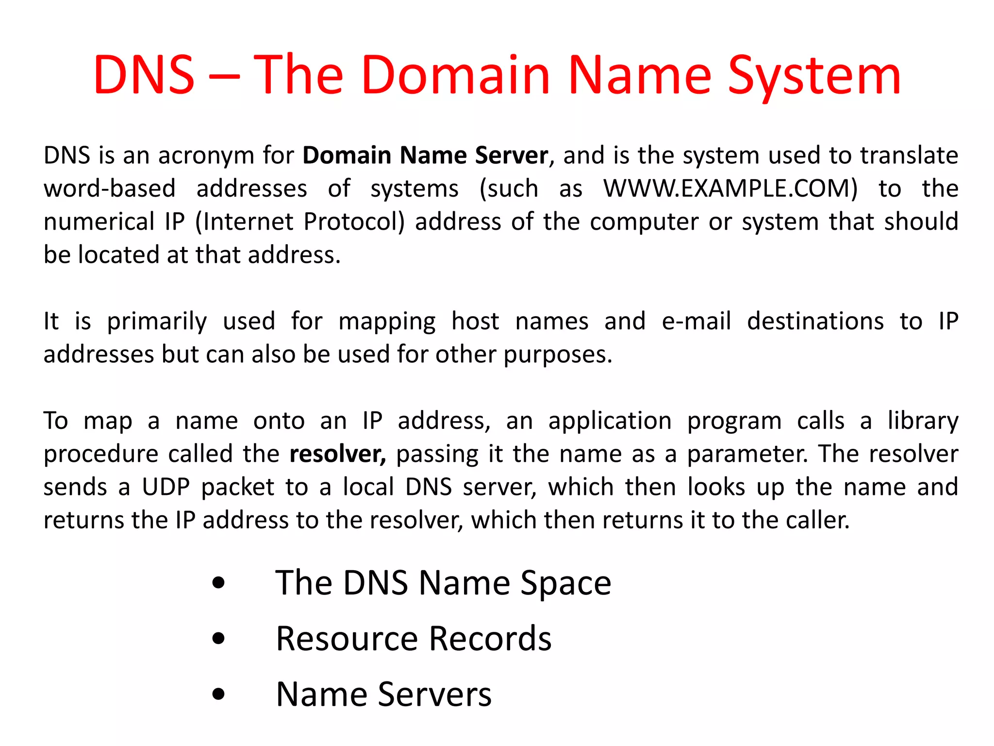 DNS maps domain names to IP addresses by using a distributed database and servers. It translates human-friendly domain names like www.example.com to numerical IP addresses like 192.0.2.1 that computers use to locate each other on the network. The DNS database contains resource records that associate domain names with IP addresses and other information. Name servers query the DNS database to resolve domain names and return IP addresses to applications and users.