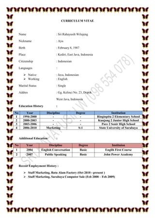 Sri Rahayusih W is applying for a marketing or public relations position with PT. Lasallefood Indonesia. She believes her strong technical experience and 3.3 GPA in marketing from State University of Surabaya make her a competitive candidate. Her key strengths include successfully attracting consumers with her speaking skills and providing exceptional customer service. She has experience with public speaking and understands the product lifecycle from marketing courses.