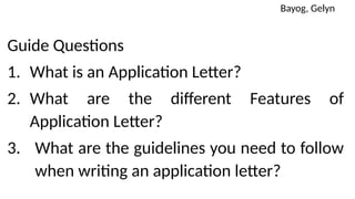 An application letter serves as a formal introduction of oneself to a prospective employer and should create a positive impression to encourage further interest. Key features include clearly outlining qualifications, maintaining a pleasing tone, and adhering to a formal format. Guidelines for writing include staying focused, stating the application's purpose early, framing the letter as an argument for one's qualifications, selecting an appropriate salutation, and proofreading for perfection.