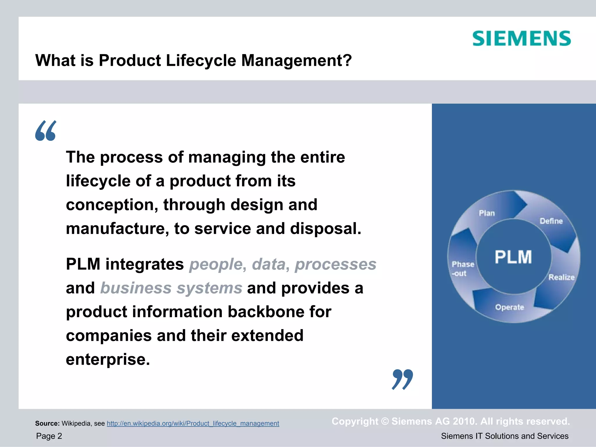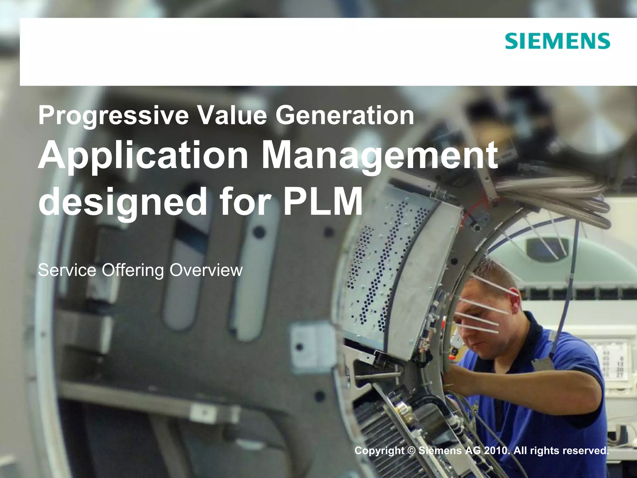 This document discusses Siemens' application management services for product lifecycle management (PLM). It provides an overview of PLM and the key business drivers for adopting it. It then explains why managing a PLM application landscape is important as complexity, interoperability, maintenance, and changes need to be addressed. The document outlines Siemens' application management services which aim to drive efficiency, evolve performance, and empower competitiveness through a transformational journey. It provides examples of service offerings tailored to different business needs and describes Siemens' global delivery model and end-to-end PLM solutions across the IT value chain.