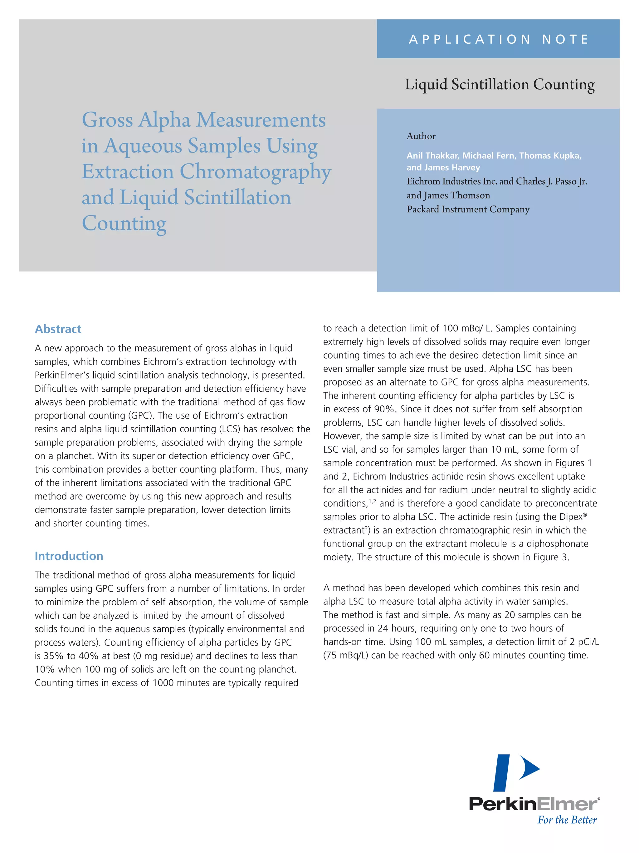 The document details a new method for measuring gross alpha activity in aqueous samples using liquid scintillation counting (LSC) combined with Eichrom's extraction chromatography, showing improved detection limits and reduced counting times. This method allows for the analysis of samples with higher levels of dissolved solids, addressing limitations of traditional gas flow proportional counting techniques. The developed technique demonstrates higher detection efficiency and faster sample preparation, making it suitable for routine laboratory use.
