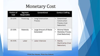 3D printing, also known as additive manufacturing, is a process for making 3D objects from a digital file by building up successive layers of material. The document discusses various 3D printing methods like stereolithography, selective laser sintering, and fused deposition modeling. It outlines applications of 3D printing in construction like printing entire buildings, houses, and interior elements layer-by-layer using large contour crafting printers. The document references projects by companies and researchers to 3D print houses and other structures by either printing on-site or in a factory and then assembling the pieces.