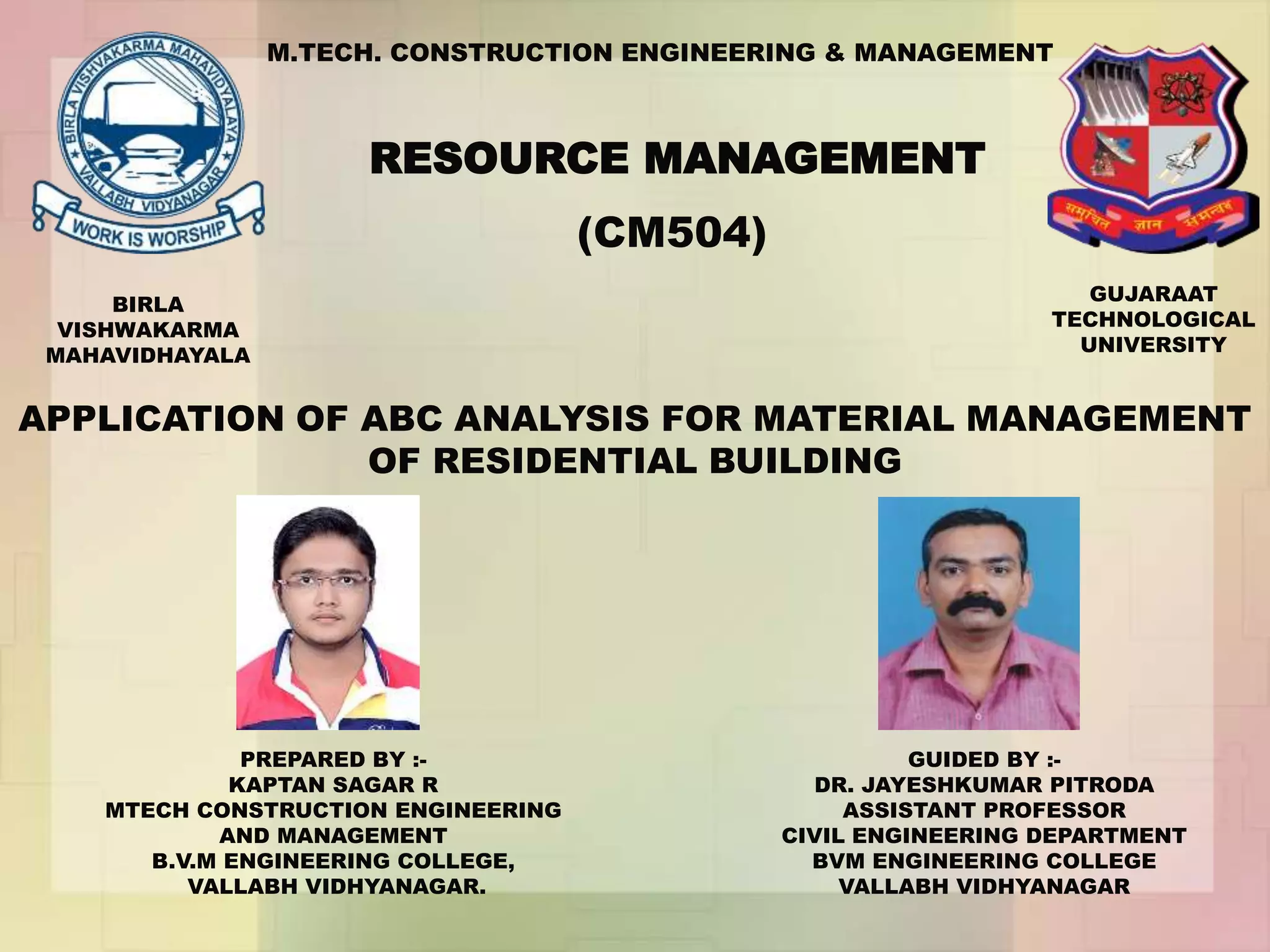 The document discusses the application of ABC analysis in material management specifically for residential building projects, focusing on planning, organizing, and controlling material flow. It outlines the objectives, functions, and benefits of material management, categorizing inventory into A, B, and C classes based on consumption value. A case study illustrates the impact of material categorization on project cost, showing that material management significantly contributes to reducing overall costs.