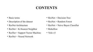 The document discusses advanced machine learning methods for crop image classification, focusing on various algorithms combined with the ResNet architecture. It presents performance metrics for different classifiers like k-nearest neighbors, support vector machines, neural networks, decision trees, and random forests, using a dataset of diseased paddy crop images. Results indicate that the hybrid approaches significantly enhance classification accuracy across multiple disease categories.