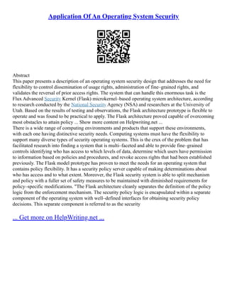 The document discusses the Flask operating system architecture prototype created by the NSA and University of Utah researchers to address the need for flexibility in controlling access rights policies. The Flask prototype was found to be practical and flexible to operate, with the ability to cleanly separate security policy logic from enforcement mechanisms. It was shown to meet the needs of a system requiring policy flexibility through a security policy server capable of making access determinations and revoking prior access rights.