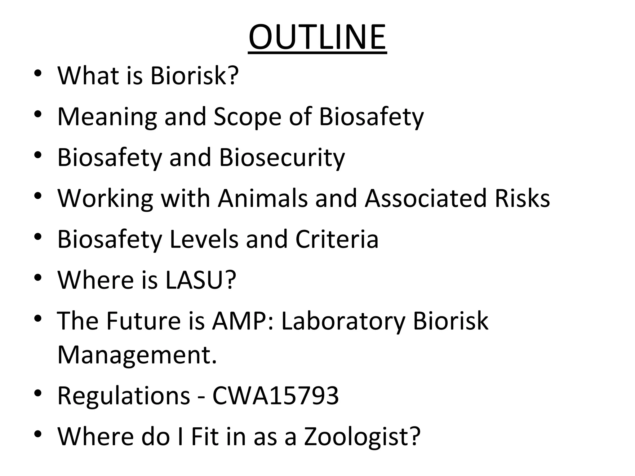 The document discusses biorisk management in relation to biosafety and biosecurity when working with animals in a laboratory setting. It outlines key concepts, risks associated with various biological materials, and biosafety levels 1 to 4, while emphasizing the need for effective management and compliance with international guidelines such as CWA 15793. It also highlights the roles and responsibilities of zoologists in ensuring safe and secure handling of biological agents in research and training.
