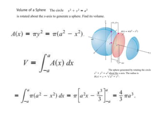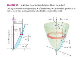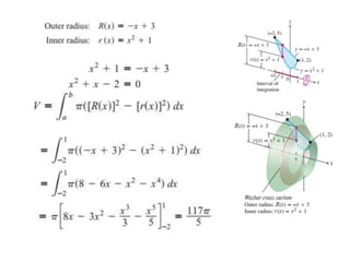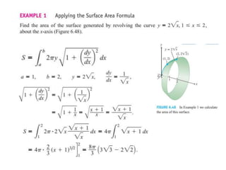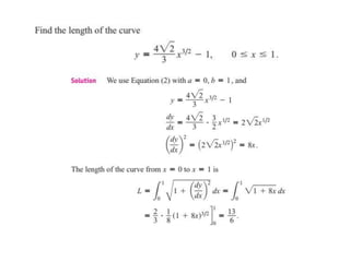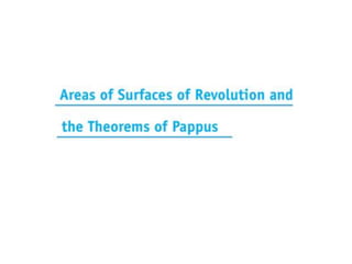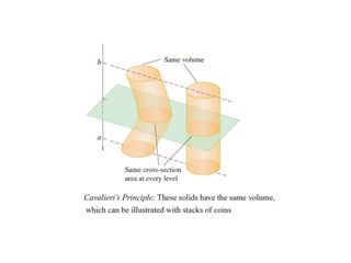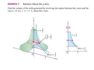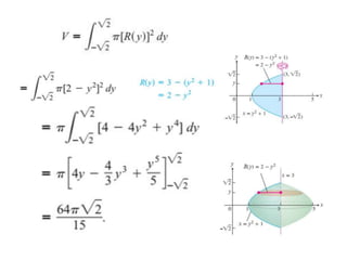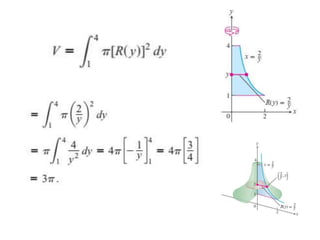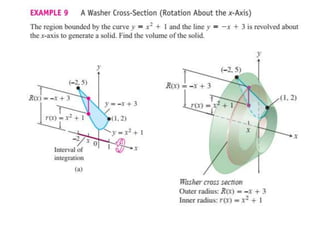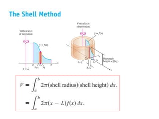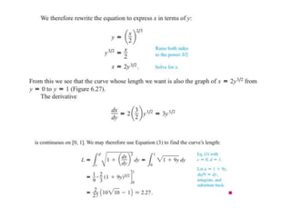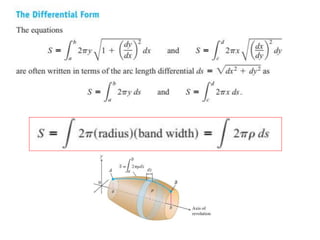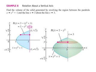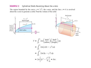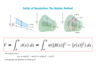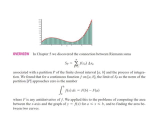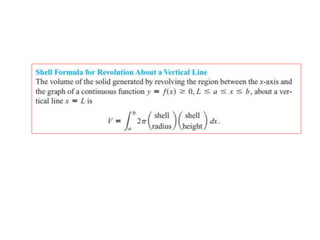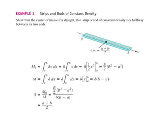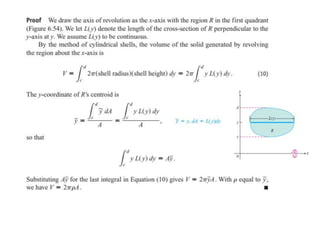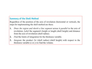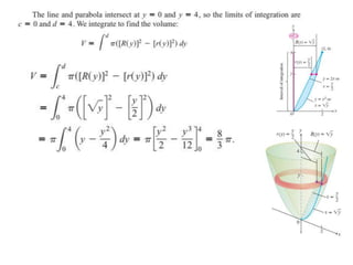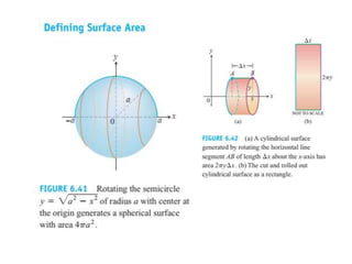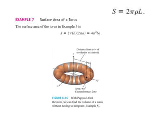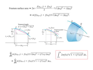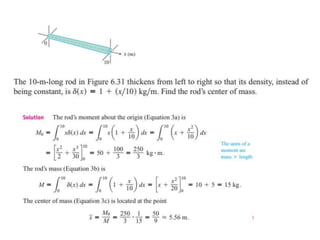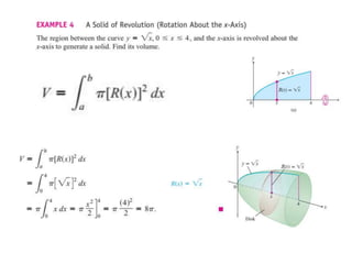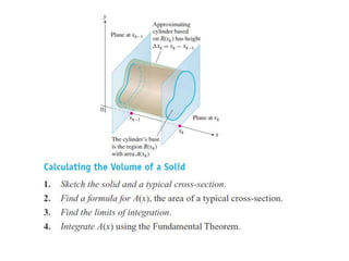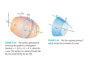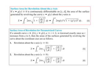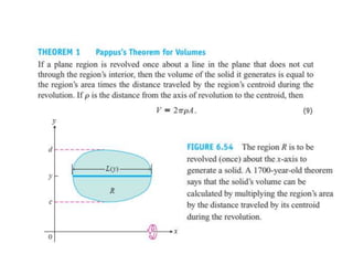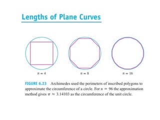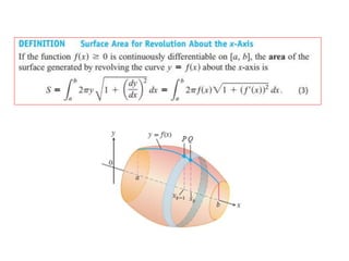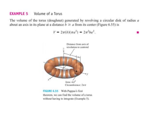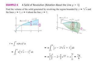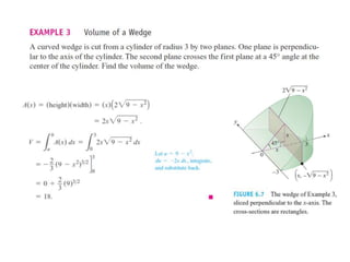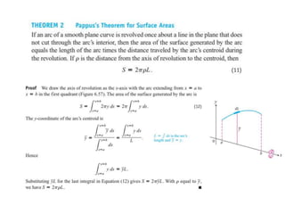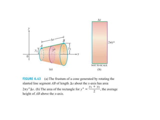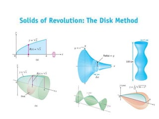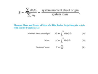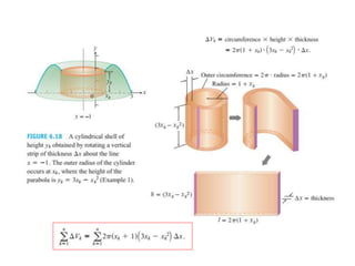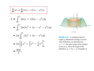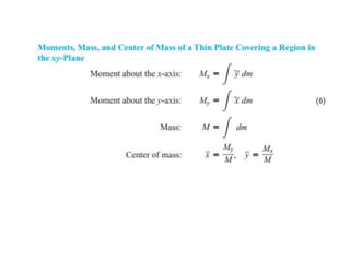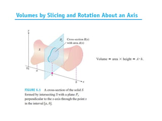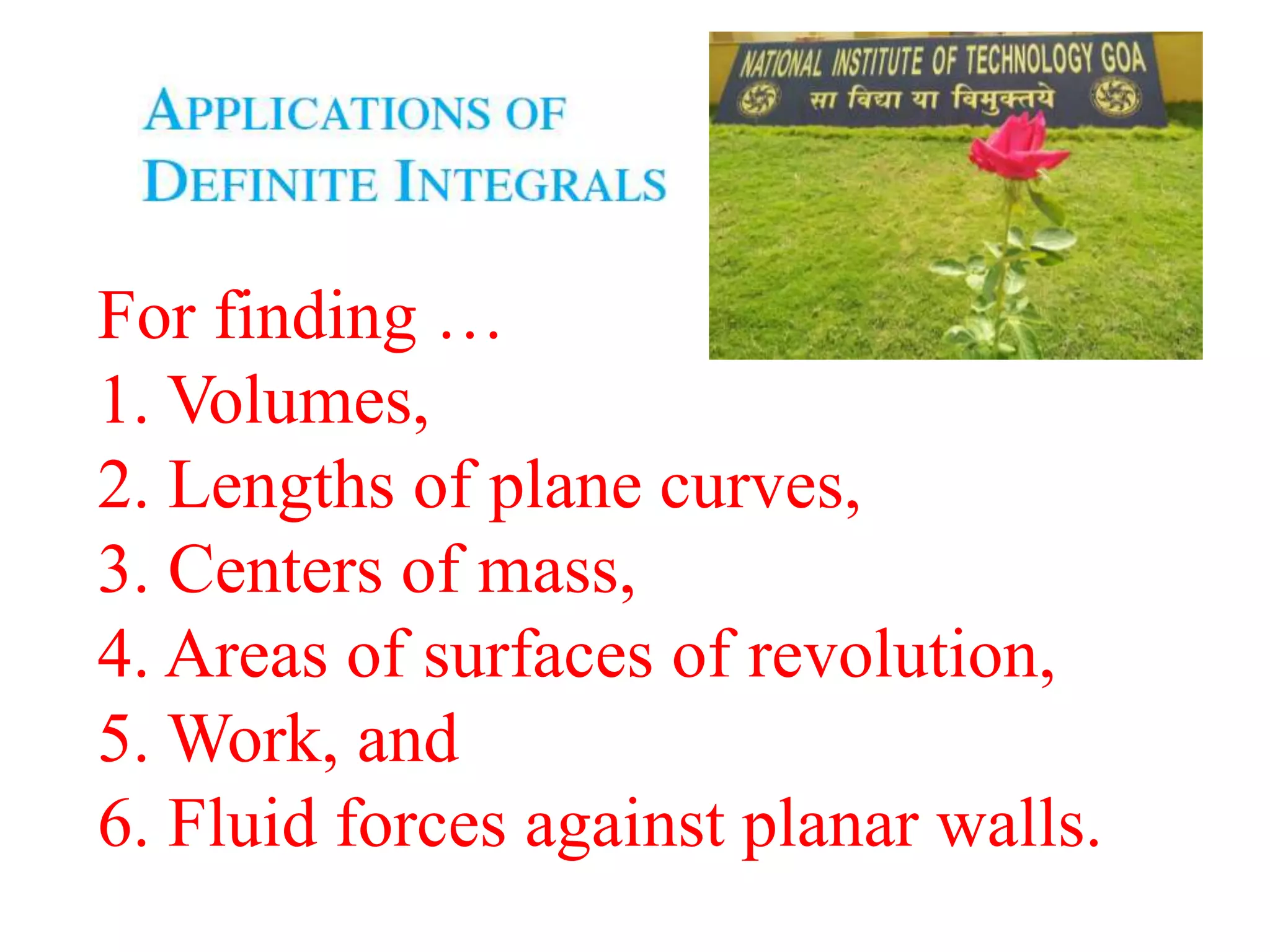 This document lists six topics that involve calculating volumes, lengths, centers of mass, areas of revolution, work, and fluid forces against walls using integration: 1) volumes, 2) lengths of plane curves, 3) centers of mass, 4) areas of surfaces of revolution, 5) work, and 6) fluid forces against planar walls.
