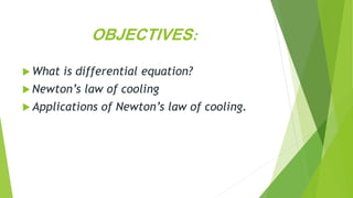 This document discusses differential equations and their application. It begins by defining what a differential equation is and provides examples of first order differential equations. It then discusses Newton's Law of Cooling, providing the derivation and formulation of the law. Several applications of Newton's Law of Cooling are presented, including using it to estimate time of death from temperature readings and determining cooling system specifications for computer processors. Other topics covered include the Mean Value Theorem, precalculus concepts, and examples of how calculus is applied in various fields such as credit cards, biology, engineering, architecture, and more.