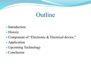 This document provides an outline for a report on electronic and electrical devices. It begins with introductions to electronics and electrical devices. It then discusses the history and components of these devices. Applications are covered in areas like communication, industry/marketing, and medical. Upcoming technologies like futuristic phones and self-driving cars are also mentioned. The document concludes by discussing making computing devices more user friendly and running them with implicit commands.