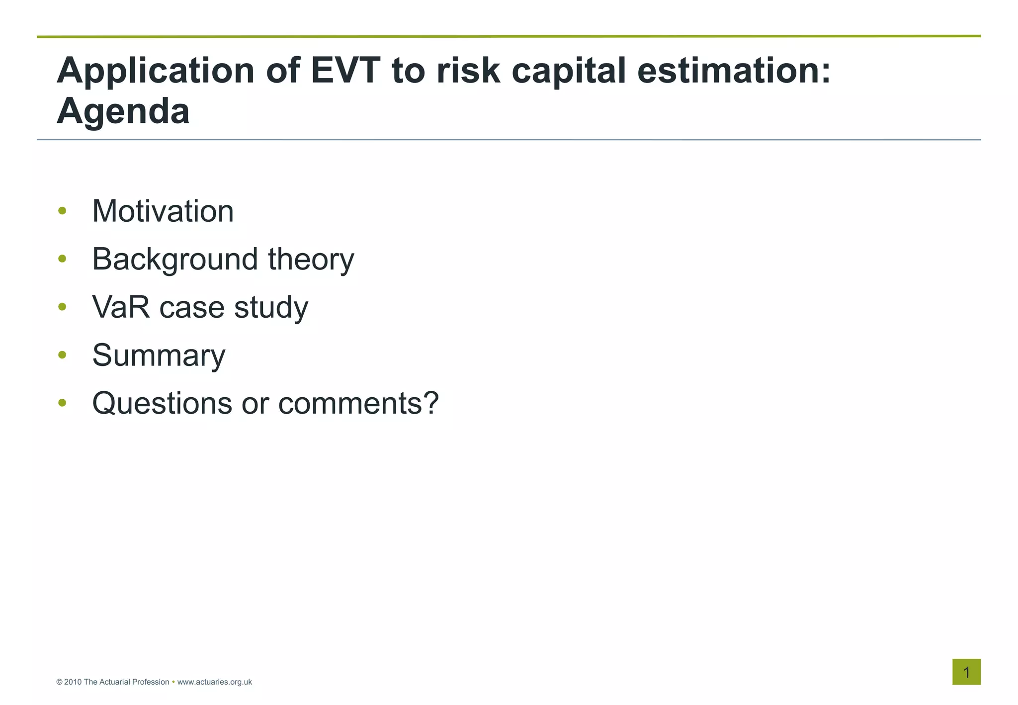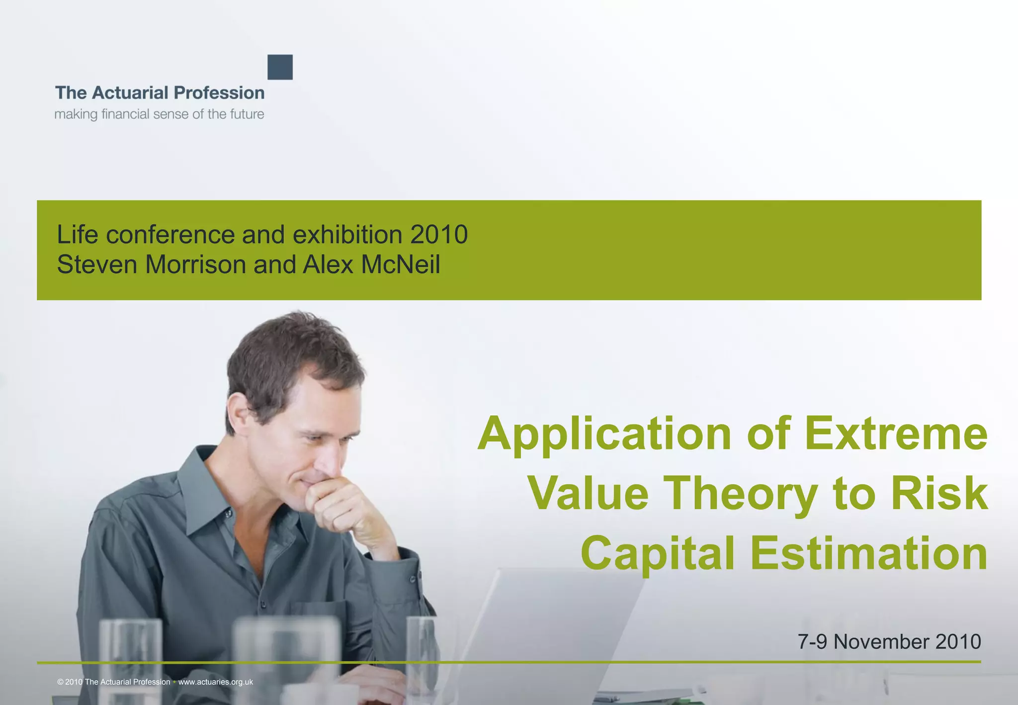 This document summarizes a presentation on applying extreme value theory to estimate risk capital requirements. The presentation discusses how simulation-based capital estimates are uncertain due to random number seed selection. It then demonstrates how extreme value theory can provide a more robust estimate of value-at-risk by fitting a generalized Pareto distribution to simulation outputs above a threshold. This allows the statistical uncertainty of capital estimates to be quantified and reduces sensitivity to random number selection compared to empirical quantile methods. The presentation concludes that extreme value theory is a useful technique for simulation-based risk and capital modeling.