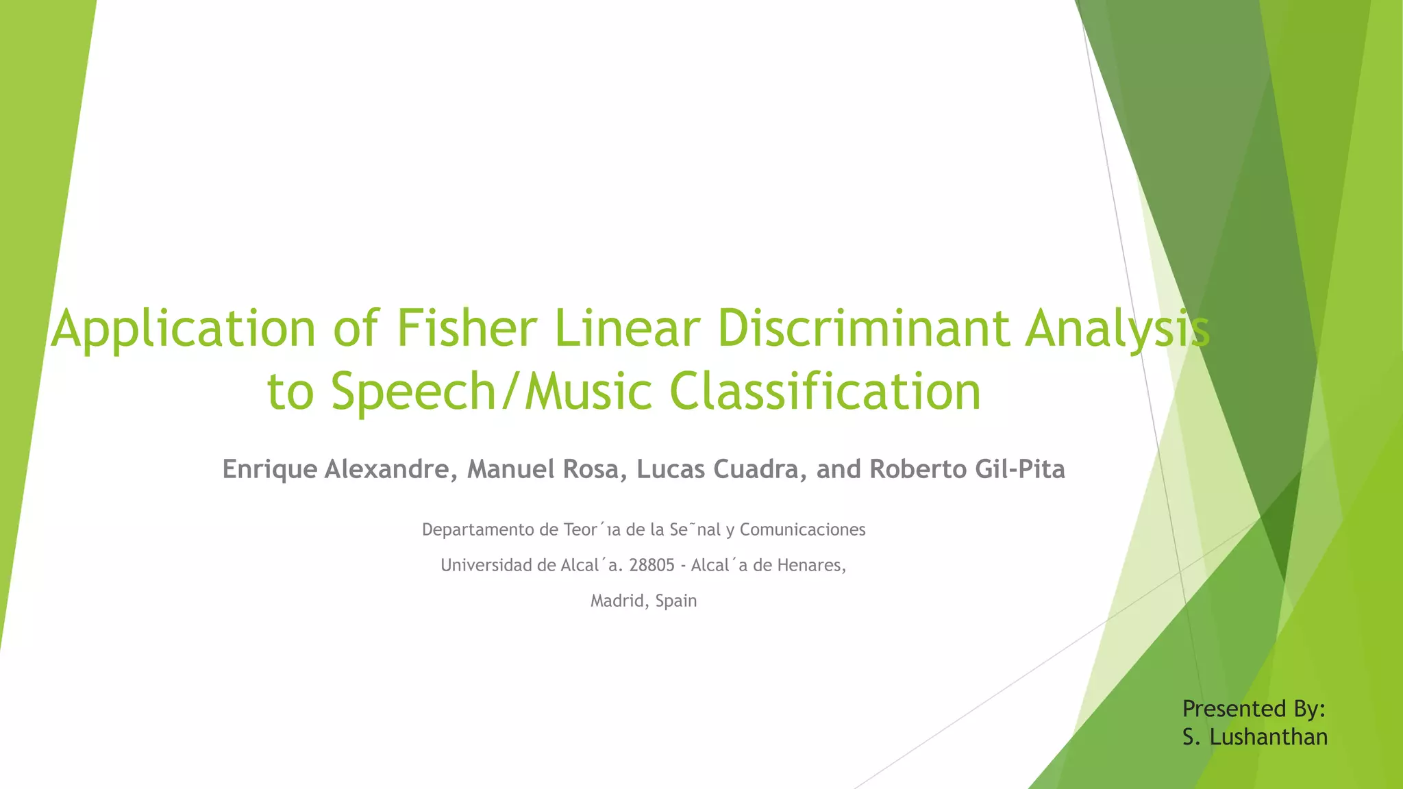 This document describes research applying Fisher Linear Discriminant Analysis (LDA) and K-Nearest Neighbors (K-NN) algorithms to classify speech and music audio clips. It finds that Fisher LDA using single features like mel-frequency cepstral coefficients achieves classification error rates below 5%, outperforming K-NN. While combining multiple features does not improve LDA results, combining the outputs of LDA and K-NN classifiers using majority voting further lowers the error rate to 4.5%, demonstrating the benefit of classifier ensembles for this task.