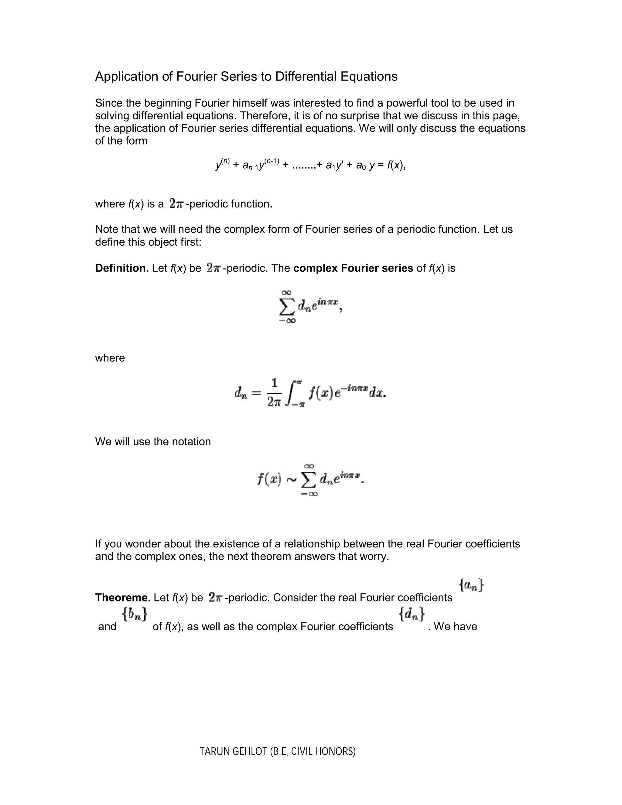 1. The document discusses the application of Fourier series to solve differential equations of the form y(n) + an-1y(n-1) + ... + a1y' + a0y = f(x), where f(x) is a periodic function.