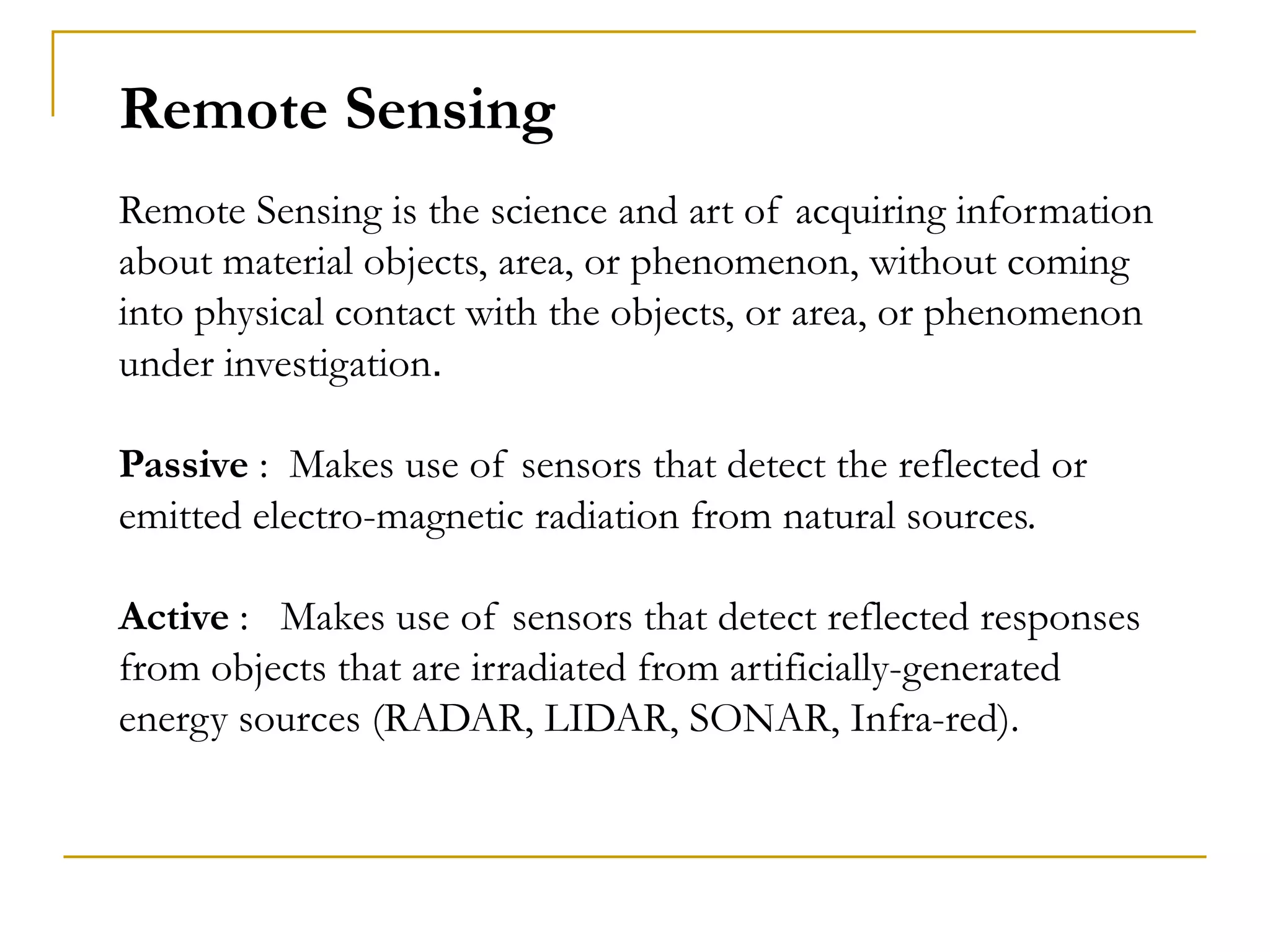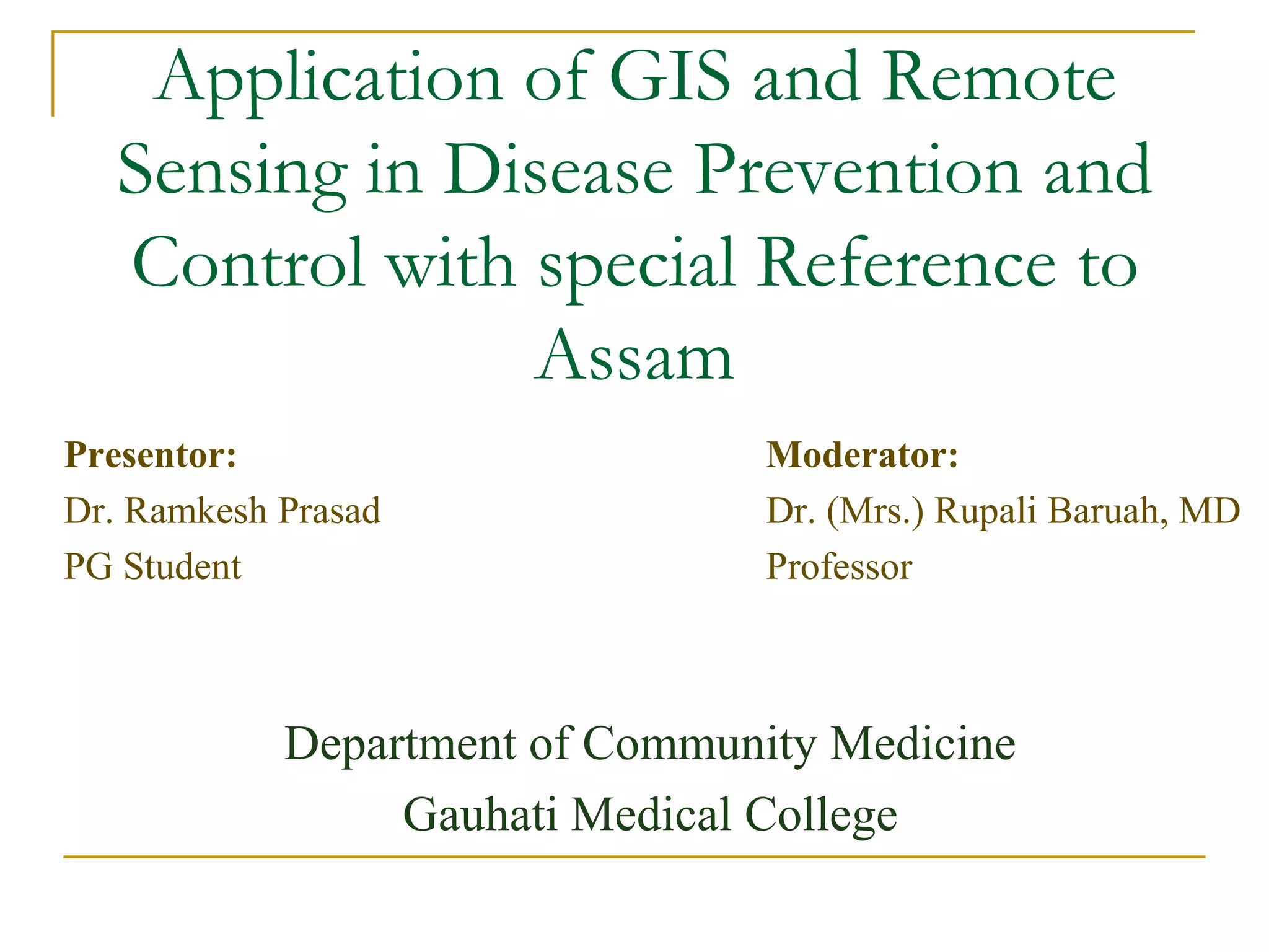 Remote sensing uses sensors to acquire information about objects or areas without direct contact. It can be passive, using natural radiation sources, or active, using artificial sources. GIS organizes spatial data in databases and allows for visualization and analysis. Both tools have many applications in public health, including disease surveillance, outbreak prediction and response, health resource allocation, and monitoring interventions over time. In Assam, a project used remote sensing and GIS along with epidemiological data to develop an early warning system for Japanese encephalitis outbreaks from 2002-2006. The NRHM in Assam has also created a web-based GIS system for health facility planning and management. Overall, remote sensing and GIS are valuable tools for improving public health when