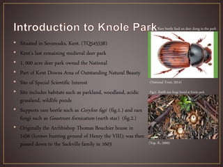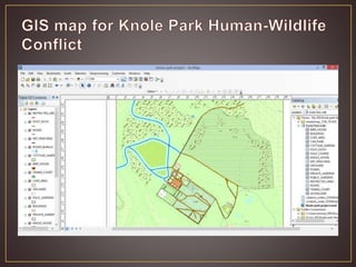 Knole Park is a 1,000 acre deer park located in Kent, England that is home to a population of 350-400 fallow deer and Japanese sika deer. Deer-human conflicts at the park include public feeding of deer, dogs harassing deer, and deer-vehicle collisions on roads within the park. Geographic information systems (GIS) can be used to map areas of high conflict such as roads, identify mitigation strategies like establishing deer fencing, and monitor deer movements to reduce human-wildlife conflicts at Knole Park.