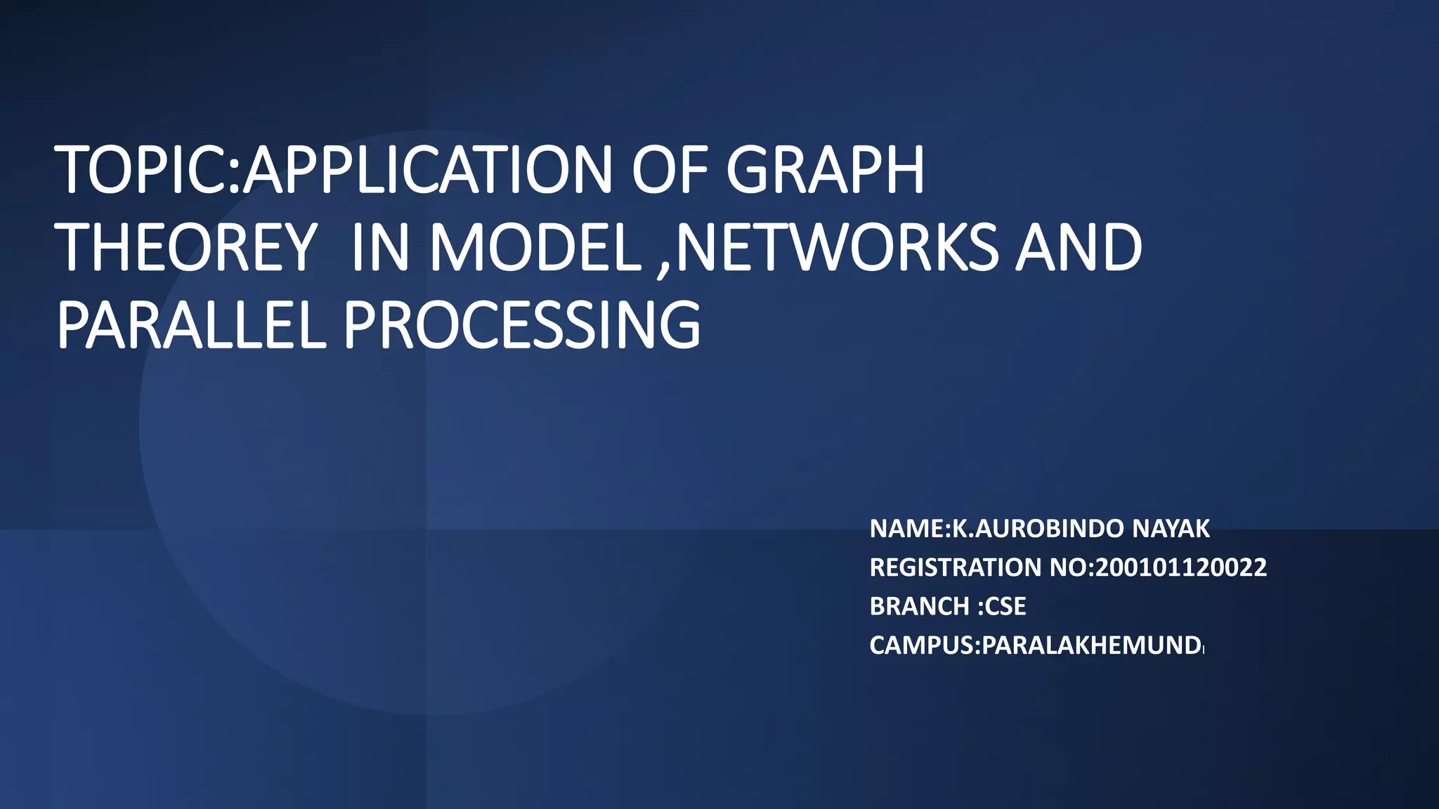 This document discusses the application of graph theory in modeling networks and parallel processing. It was written by K. Aurobindo Nayak, a CSE student with registration number 200101120022 who is studying at the Paralakhemundi campus. Some other applications of graphs mentioned include social networks, communication networks, software design, transportation networks, and biological networks. One well-studied collaboration graph is the Hollywood graph which connects movie actors who have appeared together in a film.
