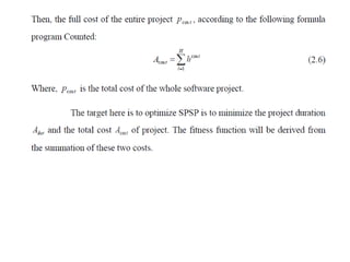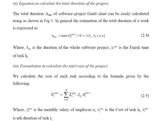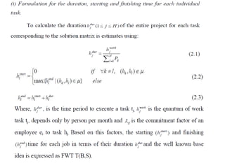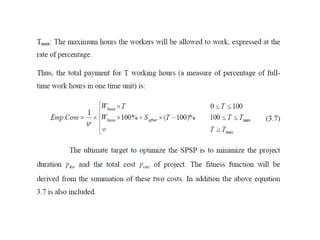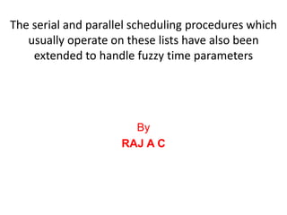 This document discusses the extension of serial and parallel scheduling procedures to accommodate fuzzy time parameters in worker compensation schemes and task priority schemes. It introduces the concept of task importance through three properties: soft deadline, hard deadline, and penalty cost. Additionally, it proposes a method using a DE algorithm with an improved mutation scheme to address deadline issues.
