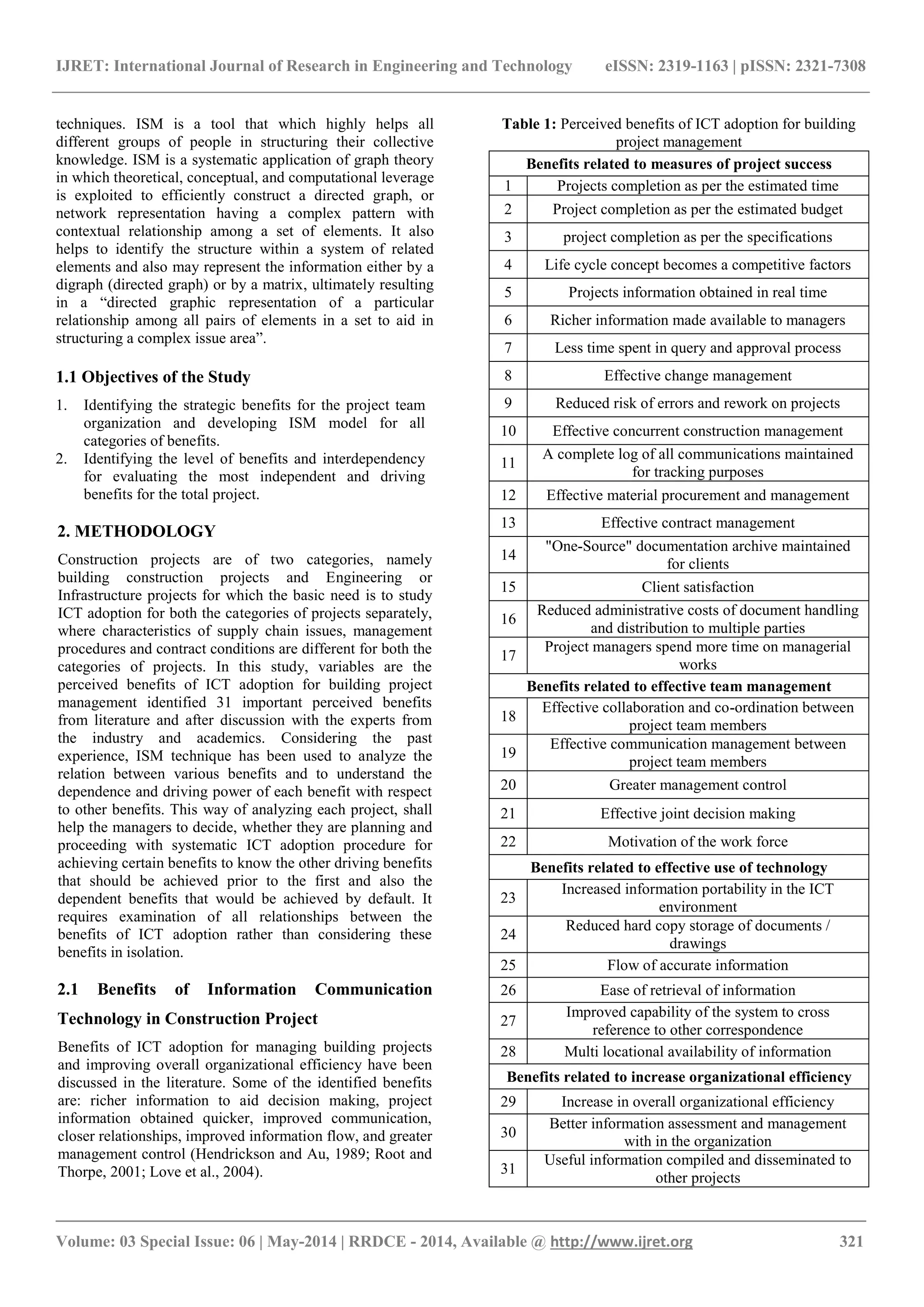 This document discusses the application of Information Communication Technology (ICT) in construction project management, emphasizing the need for effective collaboration among diverse project participants. It details the development of an Interpretive Structural Modeling (ISM) approach to identify strategic benefits and interdependencies of ICT adoption, addressing challenges in quantifying benefits and driving power. The study provides an analysis of 31 perceived benefits of ICT in building project management, which can enhance project success and organizational efficiency.