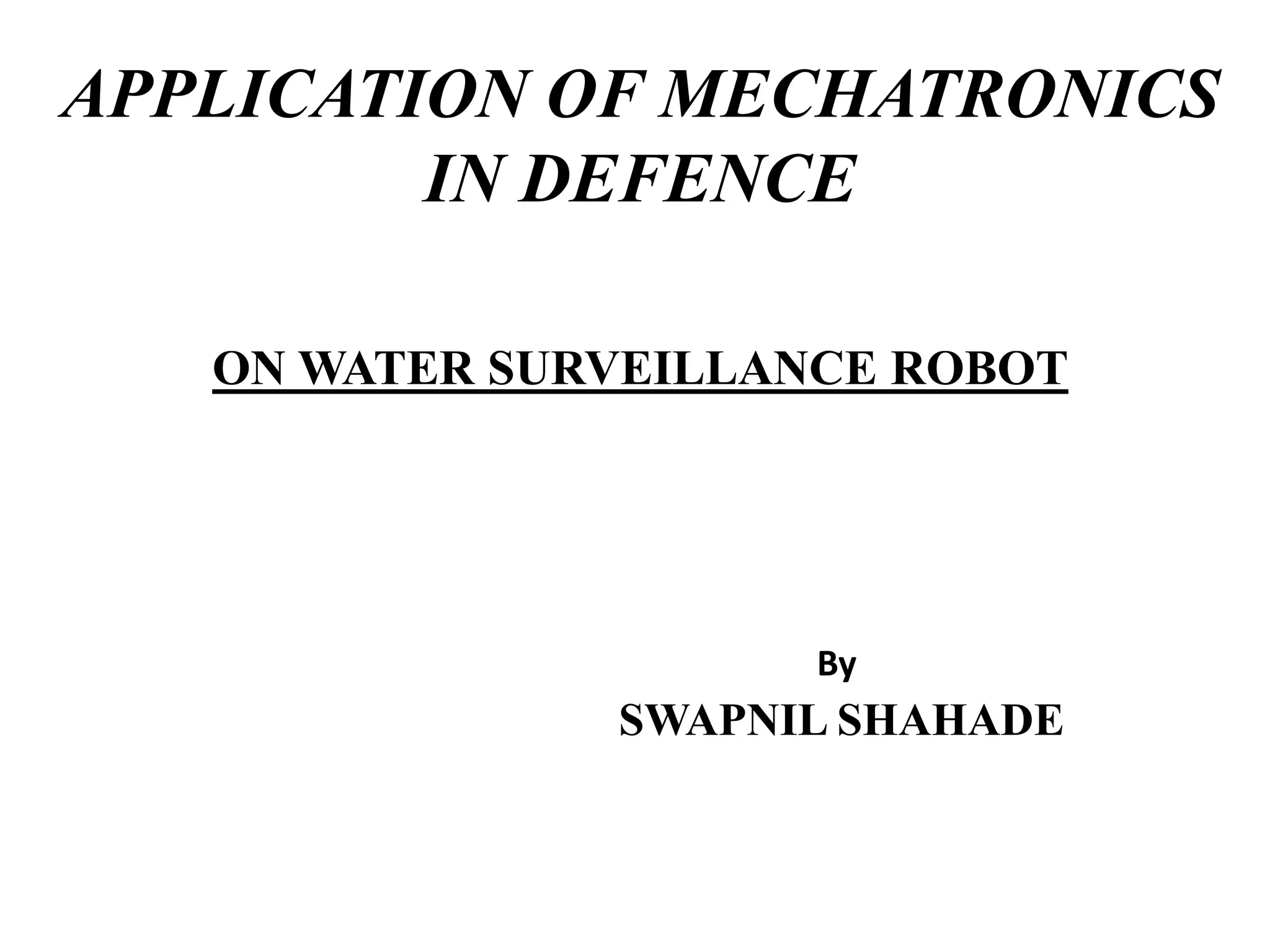 This document describes a proposed water surveillance robot. The robotic section would contain a boat with propellers driven by DC motors to allow for movement, an ultrasonic sensor to measure distance to intruders, and a laser gun that could be activated to stop intruders. The control section would allow an operator to control the boat's movement and laser gun through a wireless RF connection to the robotic section. The robot is intended to allow single-handed monitoring of water areas and to potentially help search for and rescue victims in flooded areas.