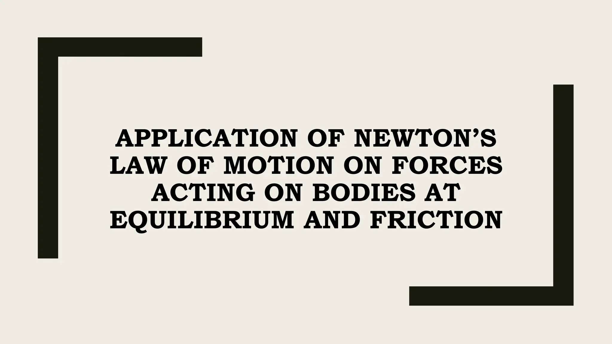 The document discusses the application of Newton's laws of motion, particularly regarding forces in equilibrium and friction. It classifies forces into contact (e.g., static and kinetic friction) and non-contact forces, explaining equilibrium conditions where the sum of forces and torques acting on an object equals zero. Various examples demonstrate problem-solving techniques for calculating tension in supporting ropes and the weights of boxes in equilibrium.