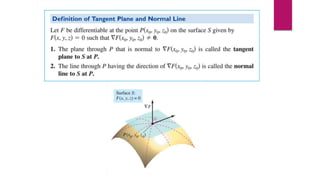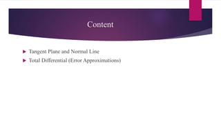 The document discusses the application of partial derivatives in calculus, focusing on the concepts of tangent planes and normal lines associated with surfaces defined by functions of two variables. It provides mathematical definitions and equations for calculating tangent planes, normal lines, and approximations of errors. Additionally, it outlines the relationship between absolute, relative, and percentage errors in calculated results.