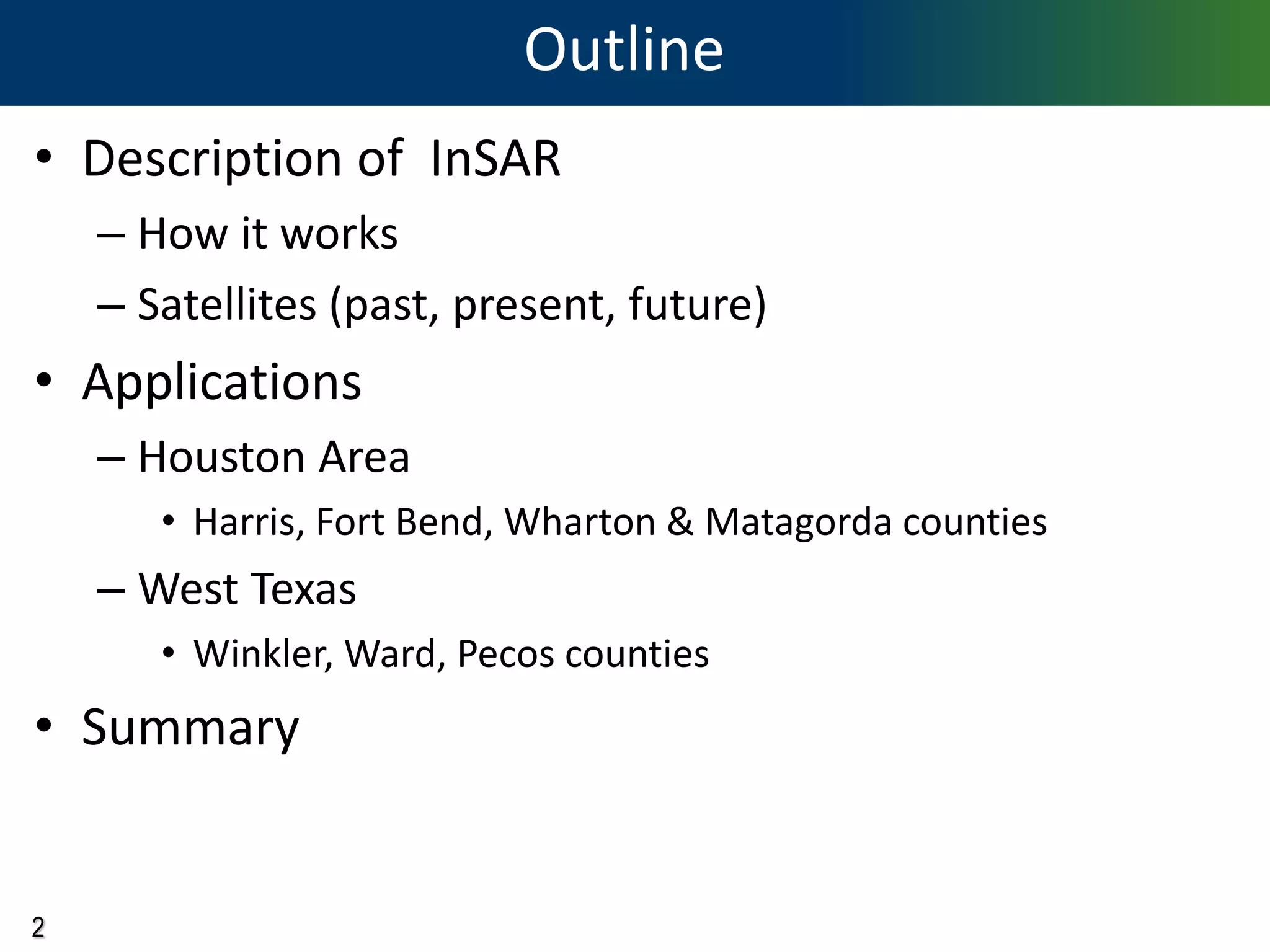 InSAR uses radar data from satellites to measure and monitor ground deformation over large areas with high precision. It works by comparing phase differences between radar images taken at different times. Recent satellite missions like Sentinel-1 and upcoming NISAR provide free and frequent data. Case studies in Texas show InSAR can detect subsidence and uplift related to oil/gas production, wastewater disposal and other human and natural causes at rates of centimeters per year over areas of 100 km squared with resolutions of tens of meters. Available data and analysis software allow low-cost, rapid evaluation of deformation trends.