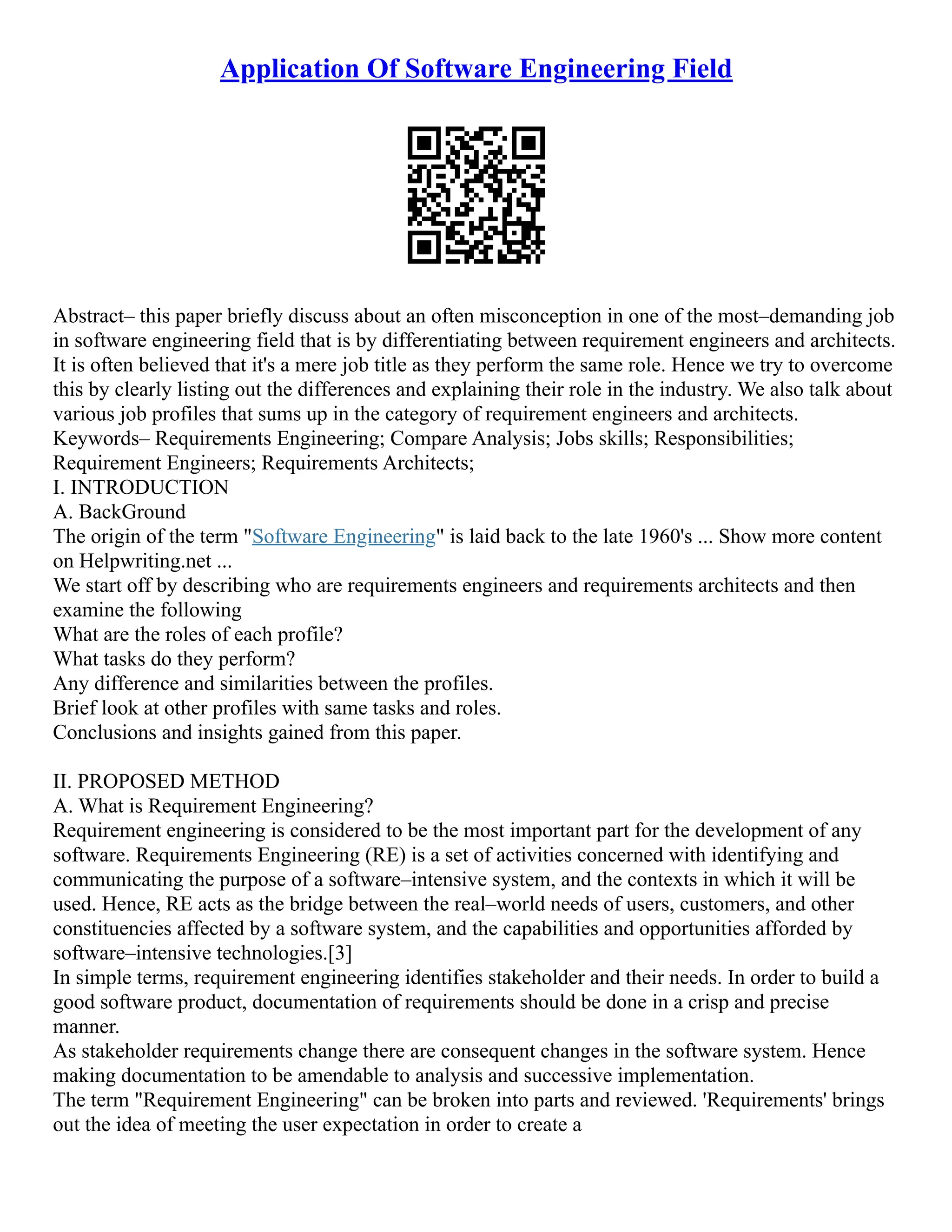 This document discusses the differences between requirement engineers and architects in the software engineering field. It aims to clarify misconceptions about their roles by outlining their different responsibilities and job profiles. The document begins by describing requirement engineers and architects, examining their roles and tasks. It looks at similarities and differences between the profiles, as well as other related job roles. The conclusion provides insights gained from comparing requirement engineers and architects.