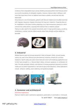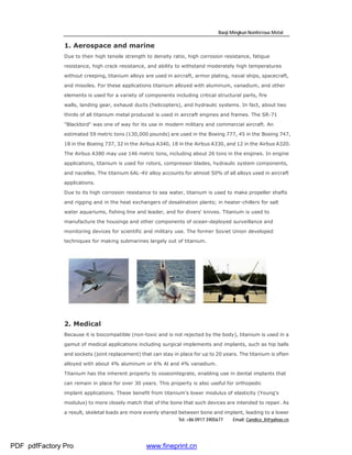 Titanium alloys are widely used in aerospace and marine applications due to their high strength, corrosion resistance, and ability to withstand high temperatures; approximately two-thirds of titanium produced is used in aircraft. In the medical field, titanium is valued for its biocompatibility and osseointegration properties, making it suitable for surgical implants and instruments. Additionally, titanium is utilized in industrial processes for its corrosion resistance and in consumer products for its lightweight and durable characteristics.