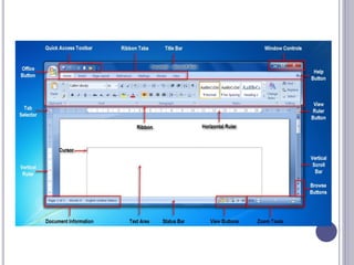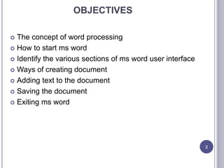 This document provides an overview of using Microsoft Word for word processing. It discusses starting Word and creating new documents or opening existing ones. Key features and components of the Word interface are described, along with how to add, edit, format and arrange text. Methods for saving, searching, printing and closing documents are also covered. The objectives are to understand the basics of word processing using Word, including how to get started, navigate the interface and perform common tasks like creating, editing and saving a document.