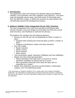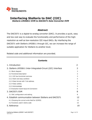 This document discusses interfacing the Stellaris LM3S811 microcontroller with the DAC5571 digital-to-analog converter over I2C. It provides an overview of the Stellaris I2C interface and how to establish communication with the DAC5571. Code examples are given to generate waveforms from the DAC5571 controlled by the Stellaris microcontroller over I2C.