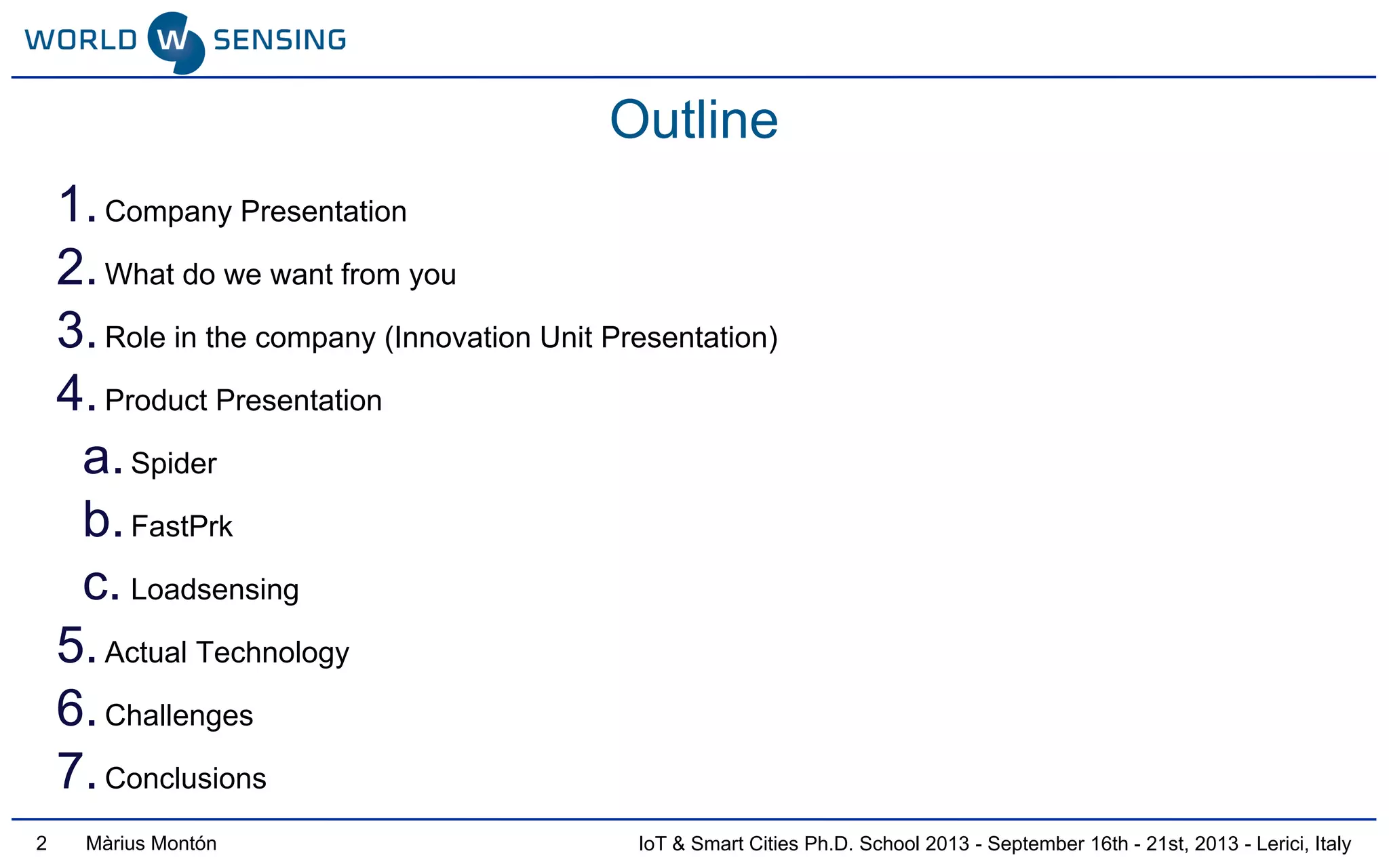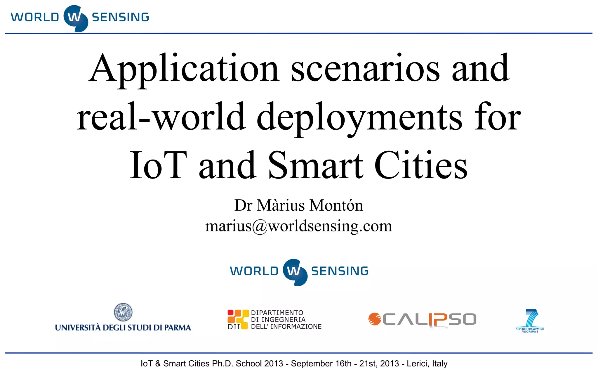 The document outlines the IoT and Smart Cities Ph.D. school held in Lerici, Italy in 2013, detailing the role of Worldsensing in advancing low power wireless sensor technologies for urban and industrial applications. It presents various products like FastPrk for intelligent parking and LoadSensing for remote construction monitoring while addressing challenges in sensor communication and operational costs. The document emphasizes collaboration and innovation in improving products and developing new market-driven solutions.
