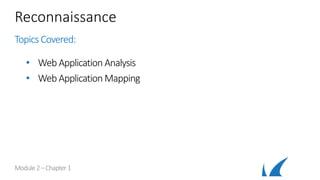 This document provides an overview of topics related to analyzing and attacking web applications. It discusses techniques for reconnaissance like using Wireshark, browser plugins, proxies, scanners and fuzzers to gather information. It also covers mapping applications, identifying vulnerabilities outlined in the OWASP Top 10 like injection, XSS and insecure authentication, and additional risks like clickjacking, denial of service and information leakage.