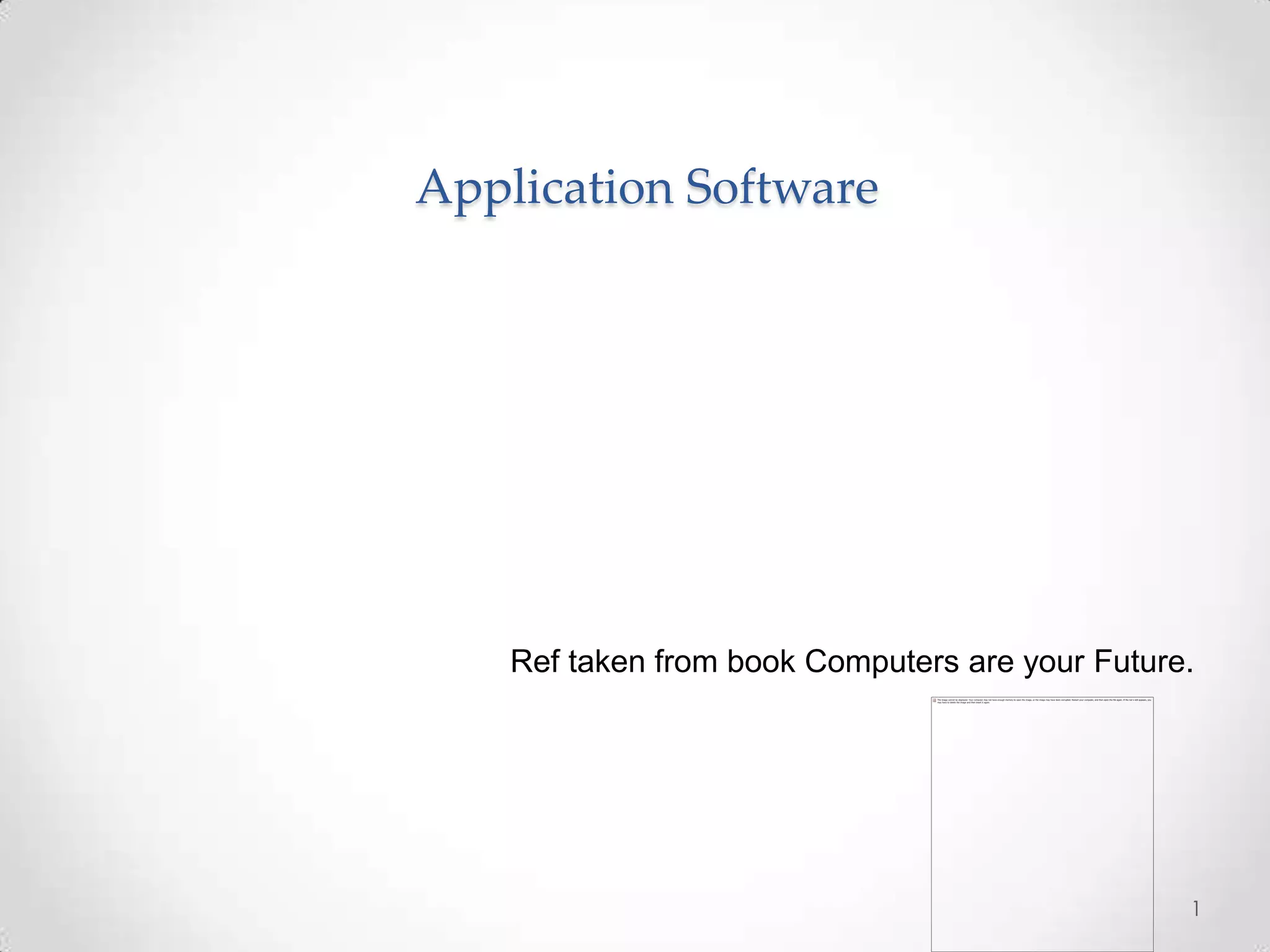 This document discusses application software and provides examples of common productivity, media, and graphic programs. It describes how productivity programs like Microsoft Office and its components help users complete tasks more efficiently. It also explains how media programs allow incorporating different file types and how graphic programs are used to create and edit images and visual content. The document outlines different types of application software and their basic functions.