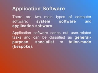 The document explains the types of application software, emphasizing general-purpose software that performs various tasks such as word processing and spreadsheets. It contrasts this with specialist software designed for specific tasks and bespoke software tailored for individual companies, highlighting the pros and cons of each. Additionally, it outlines considerations for purchasing new software, including cost, compatibility, and user support.