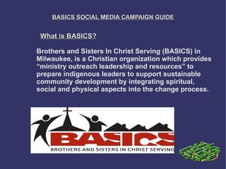 The document provides guidance on running a social media campaign for Brothers and Sisters In Christ Serving (BASICS), a Christian organization in Milwaukee. It outlines BASICS' mission to build relationships between urban and suburban communities. The document discusses the benefits of a social media campaign, strategies for success, and tips for using key platforms like YouTube, Twitter and Facebook to engage volunteers, donors and partners. It also provides recommendations for measuring the impact of campaign efforts.