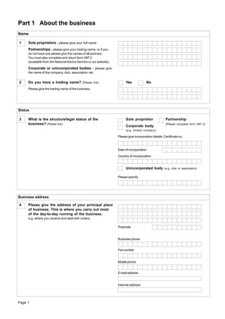 This document is an application form for registration for Value Added Tax (VAT) in the United Kingdom. It requests information about the applicant's business such as the business name and address, legal structure, activities, and bank account details. It also asks for estimates of taxable and exempt supplies to determine if the applicant needs to register for VAT. The applicant must sign a declaration that the information provided is true and complete.